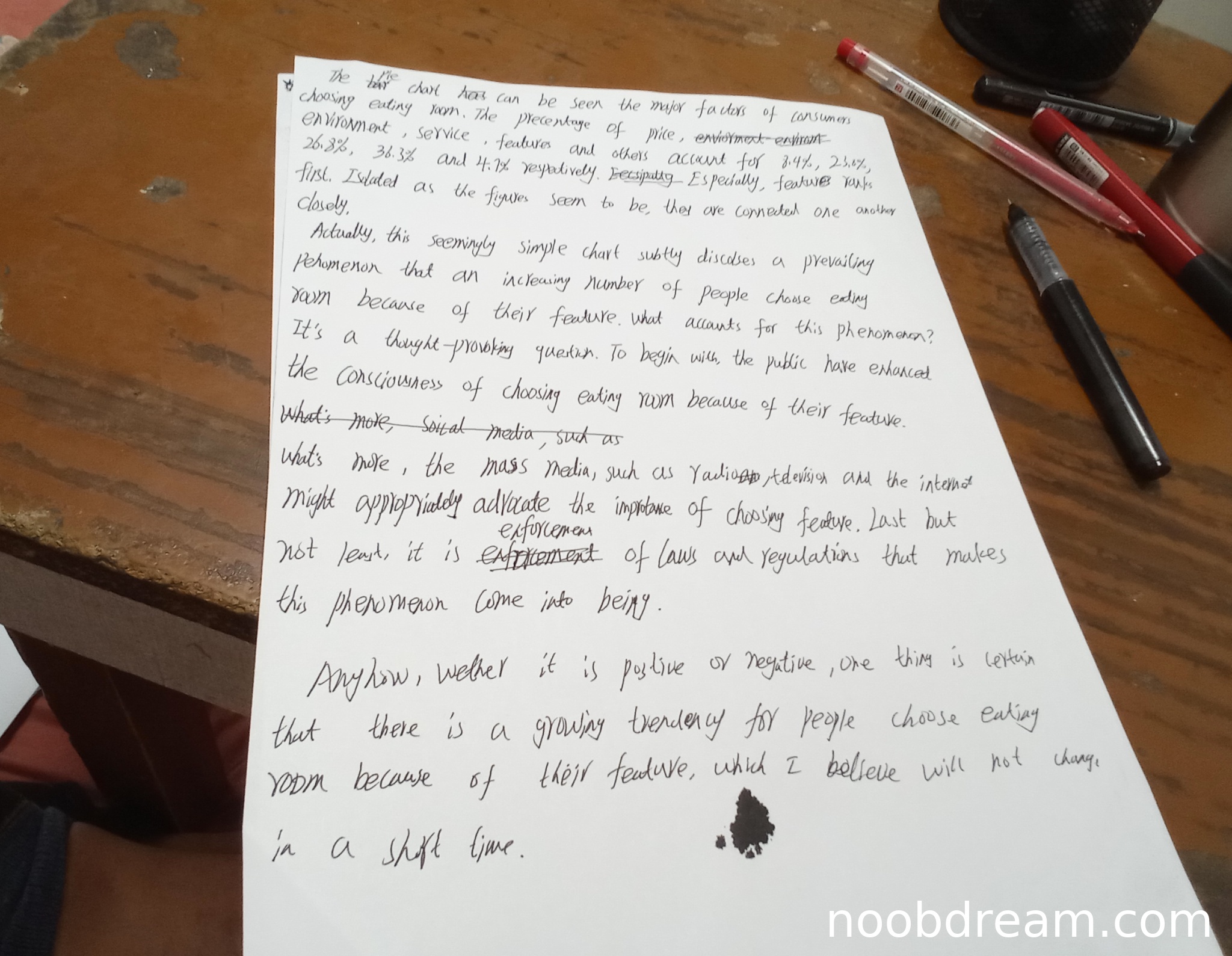 理由:学生基本完成了图表解读任务,包含了主要数据点(特色36.3%、服务26.8%、环境23.8%),但遗漏了价格(8.4%)和其他(4.7%)这两个次要因素。根据评分标准第三档"虽然漏掉了一些内容,但包含多数内容要点",此处扣1分。