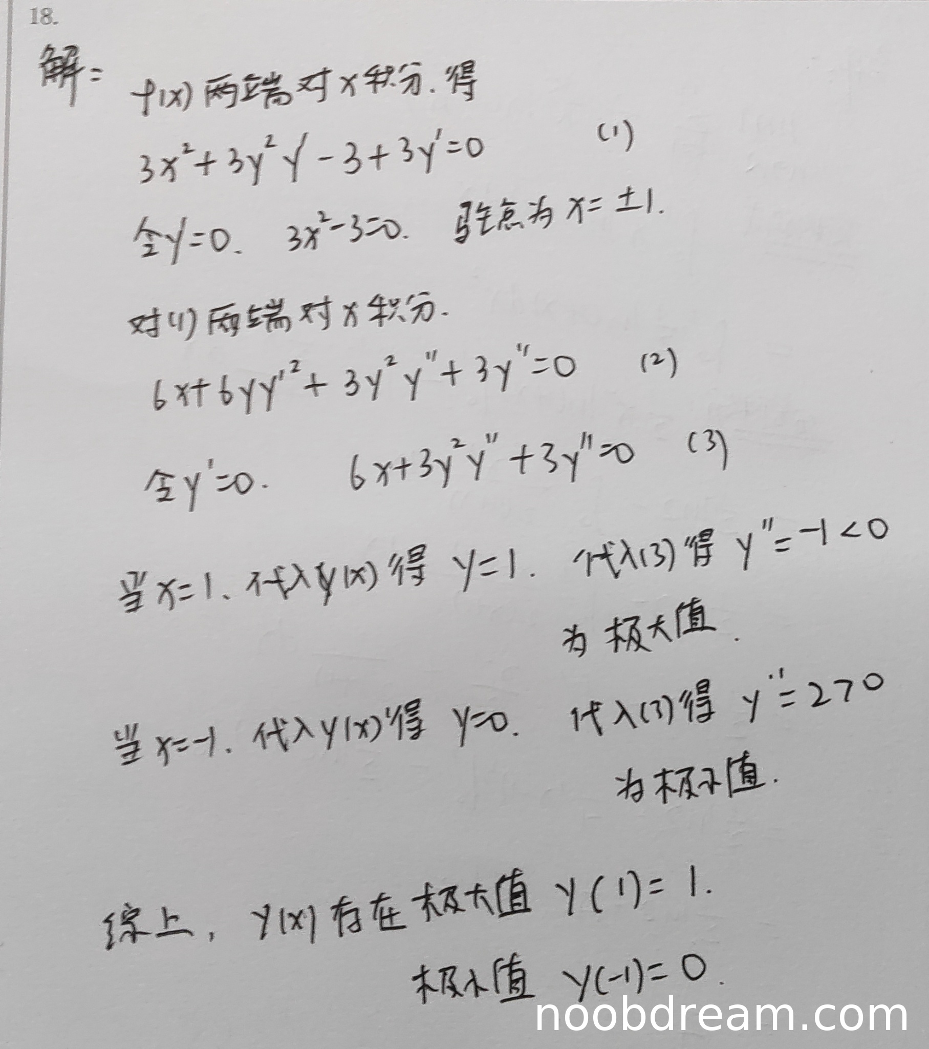 学生作答与标准答案完全一致,解题过程完整正确: 1. 正确对原方程求导得到关系式(1) 2. 正确令y'=0求得驻点x=±1 3. 正确对(1)式再次求导得到(2)式 4. 正确将驻点代入原方程求得对应y值 5. 正确利用二阶导数判断极值类型 6. 正确写出极值结果 整个过程逻辑严谨,计算准确,因此给满分10分。