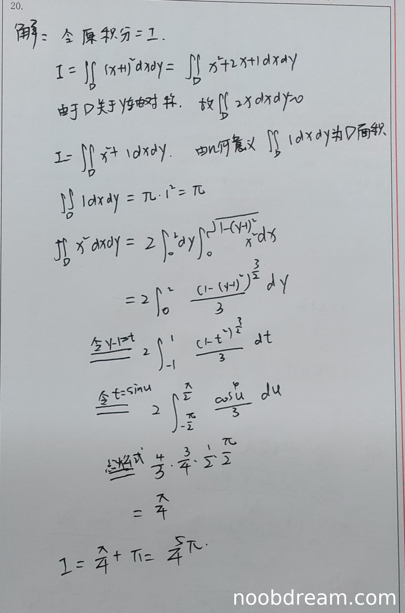 学生正确地将二重积分拆分为三部分,并利用对称性得出 \(\iint_D 2x \, dxdy = 0\),思路正确。计算 \(\iint_D 1 \, dxdy\) 时正确识别区域为圆并给出面积 \(\pi\)。计算 \(\iint_D x^2 \, dxdy\) 时,学生采用直角坐标并转化为定积分,虽然方法不同于标准答案的极坐标,但思路正确且最终结果 \(\frac{\pi}{4}\) 正确。过程中存在以下问题: