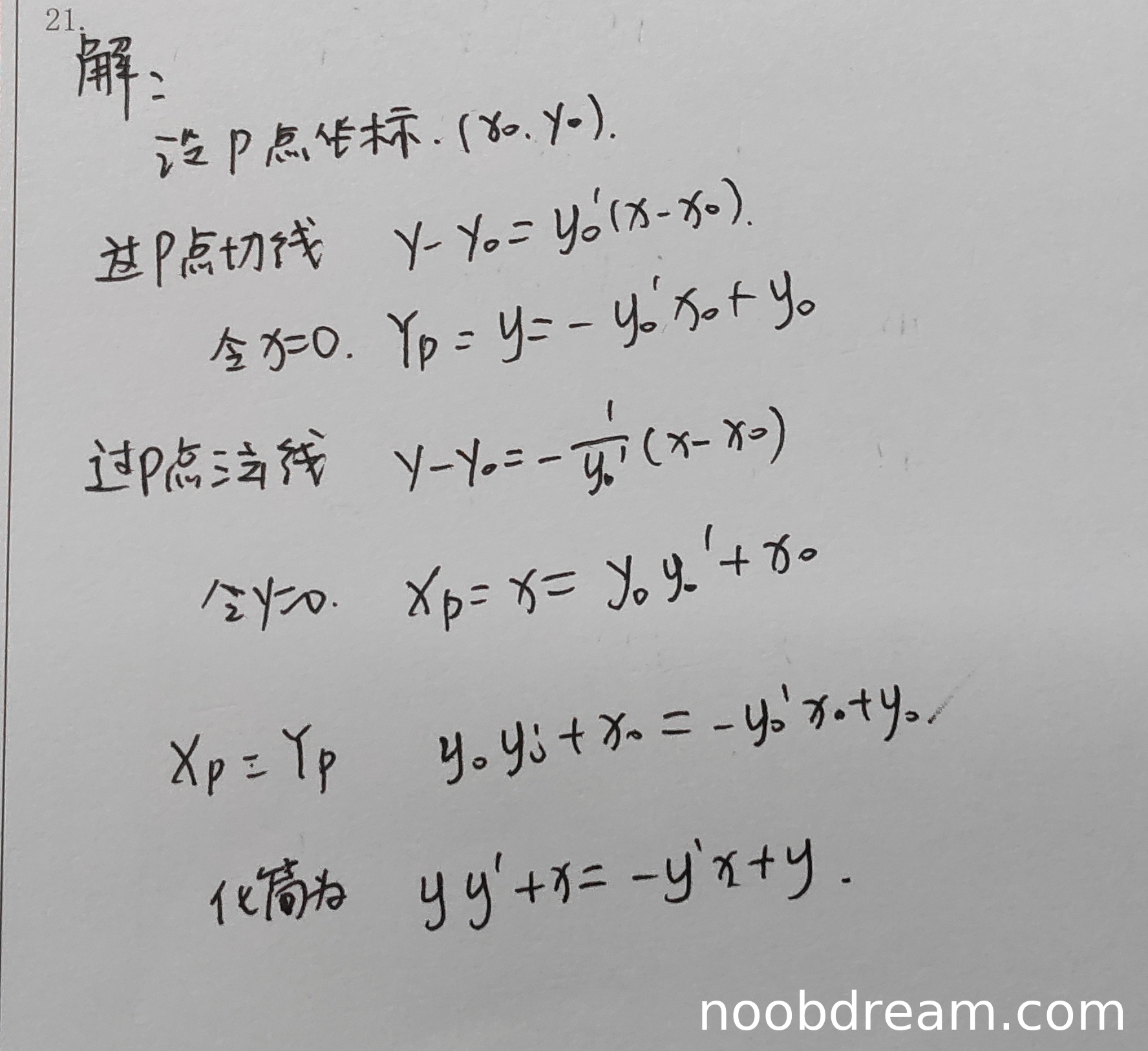 学生正确设定了P点坐标,并写出了切线方程和法线方程。通过令X=0和Y=0分别求得了Y_P和X_P的表达式。根据题意X_P=Y_P建立了方程,得到了正确的微分方程:yy'+x=-y'x+y。