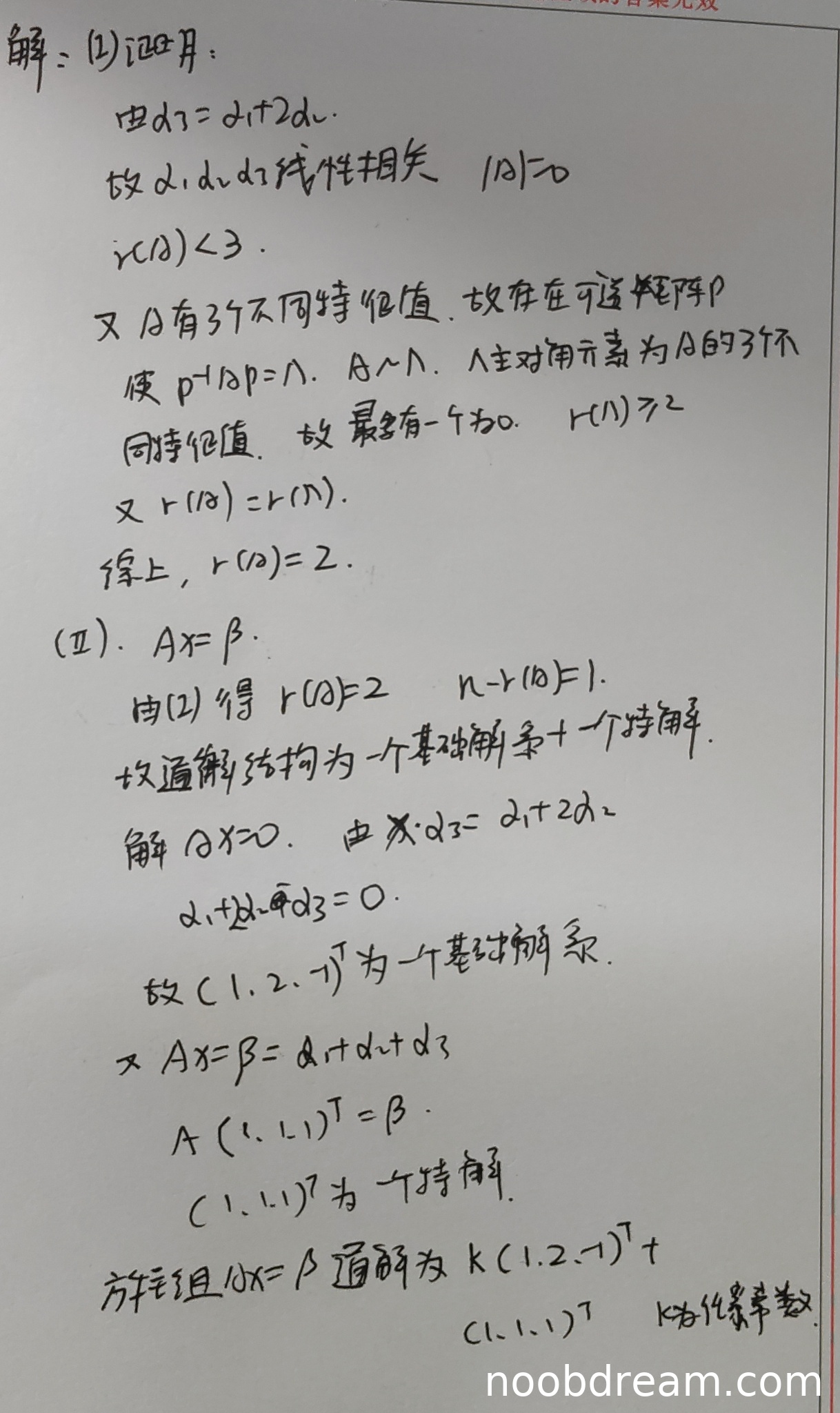 学生答案正确。首先由α₃=α₁+2α₂得出α₁,α₂,α₃线性相关,|A|=0,r(A)<3;然后利用A有三个不同特征值且可相似对角化,说明Λ的对角元素最多有一个0,因此r(Λ)≥2,结合r(A)=r(Λ)得出r(A)=2。虽然表述与标准答案略有差异,但逻辑完整正确。得5分。