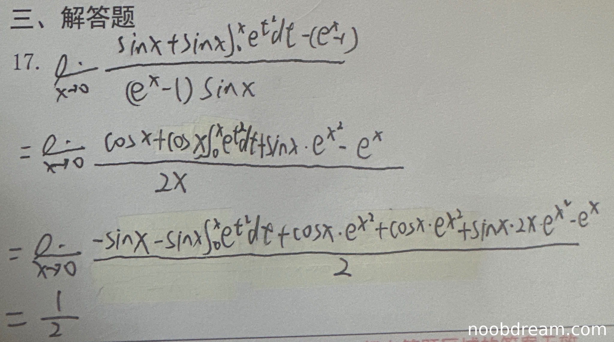 学生作答的整体思路正确,采用了通分后利用等价无穷小替换和洛必达法则求解极限,最终得到正确答案1/2。具体分析如下: