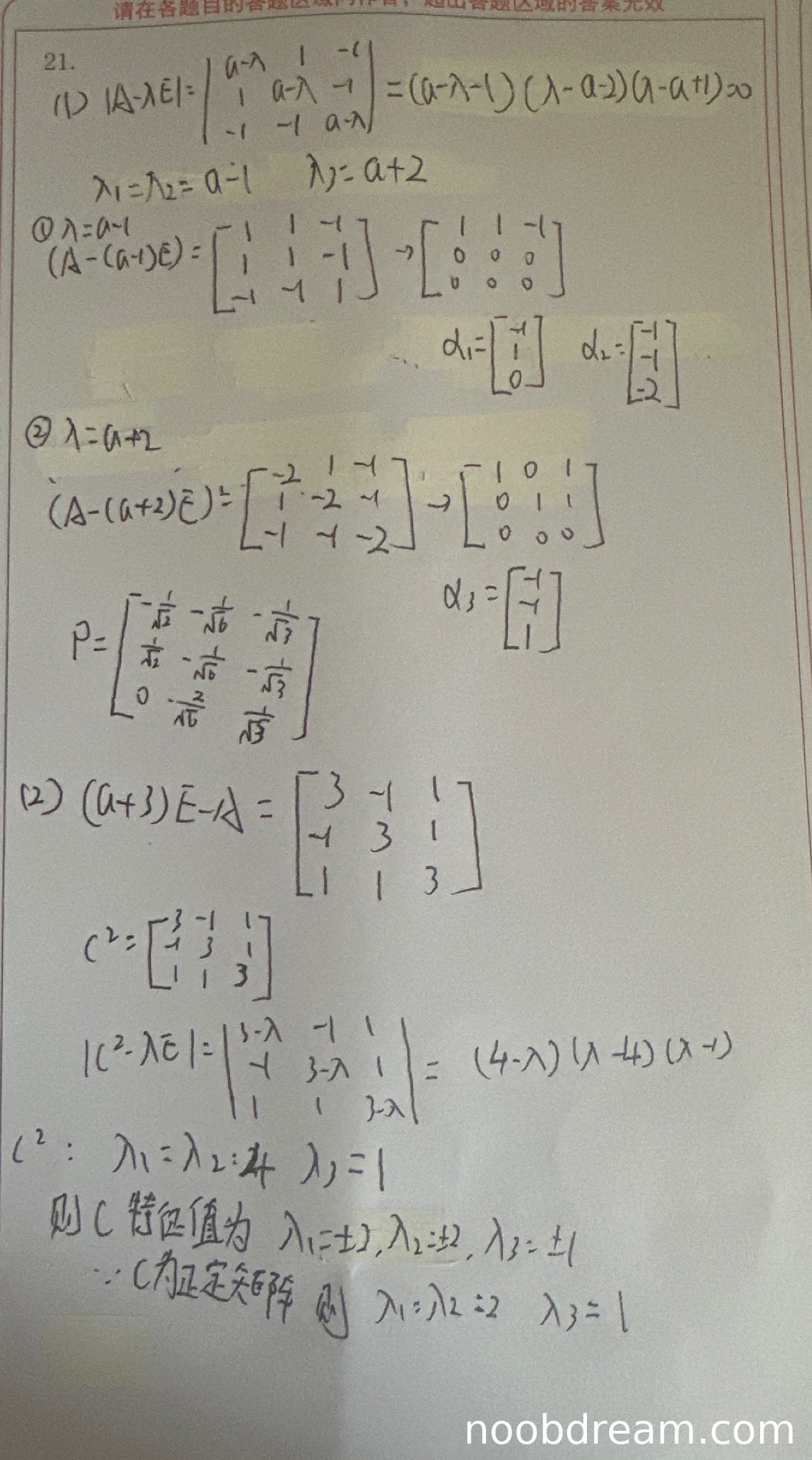 学生错误地将C直接取为(a+3)E-A(扣2分),然后计算C²得到错误结果(扣1分)。虽然认识到C²的特征值与C的特征值的关系,并正确得出C的特征值应为2,2,1(1分),但未能利用(Ⅰ)中的对角化结果来构造正定矩阵C,解题思路完全偏离标准方法(扣2分)。最终得分:1-2-1-2=-4分,按0分计。