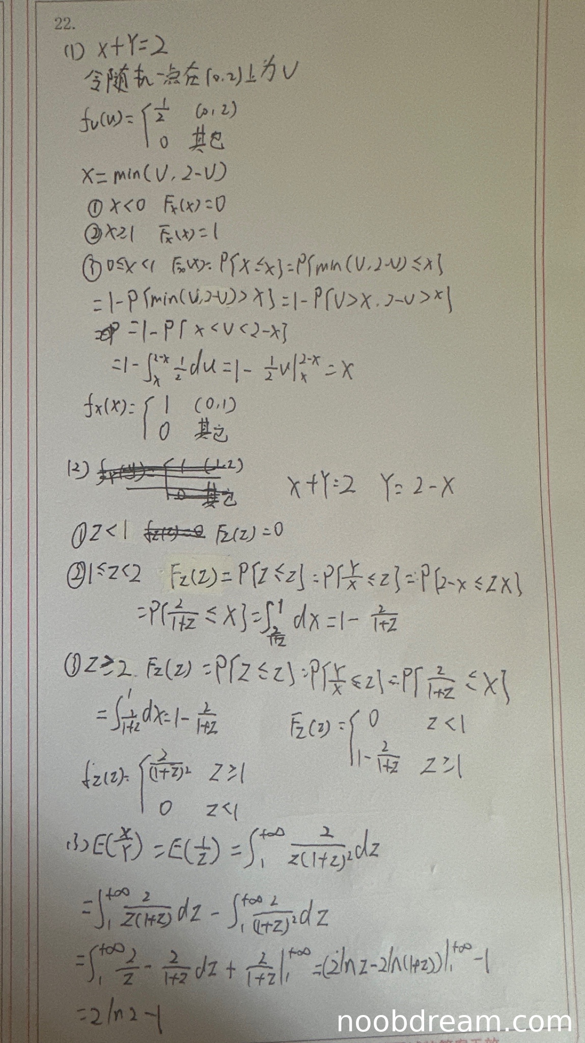 学生在计算Z的分布函数时,对z≥1的情况给出了统一表达式,与标准答案分段处理(z≥1)的结果实质相同。密度函数推导正确。但在分布函数表达中,对z≥2的情况单独列出虽不必要,但不影响最终结果,不扣分。得4分。