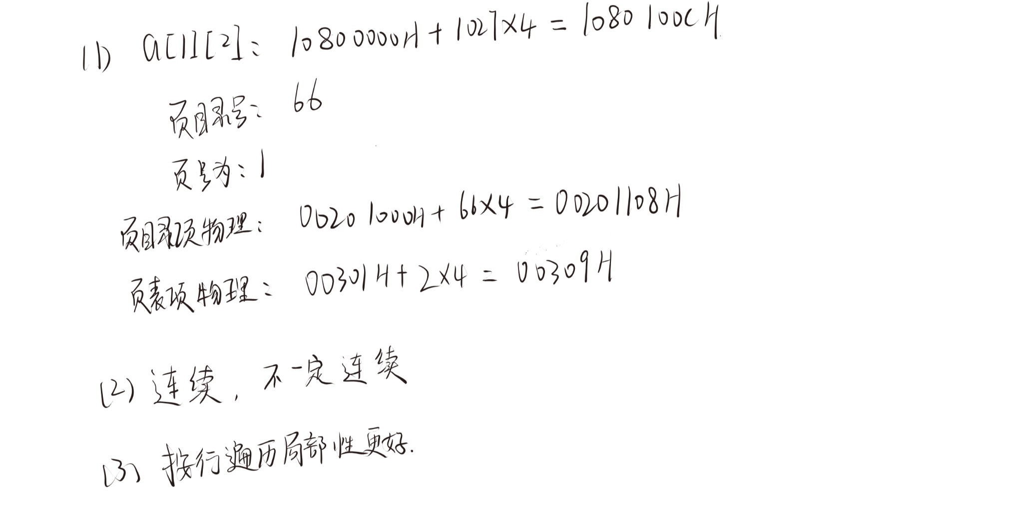 - 虚拟地址计算:a[1][2]的虚拟地址计算为1080100CH,但正确答案应为10801008H。学生计算时1027×4=4108,十六进制为100CH,但起始地址10800000H+100CH=1080100CH,而正确答案是10801008H。这里存在计算错误,应扣1分。