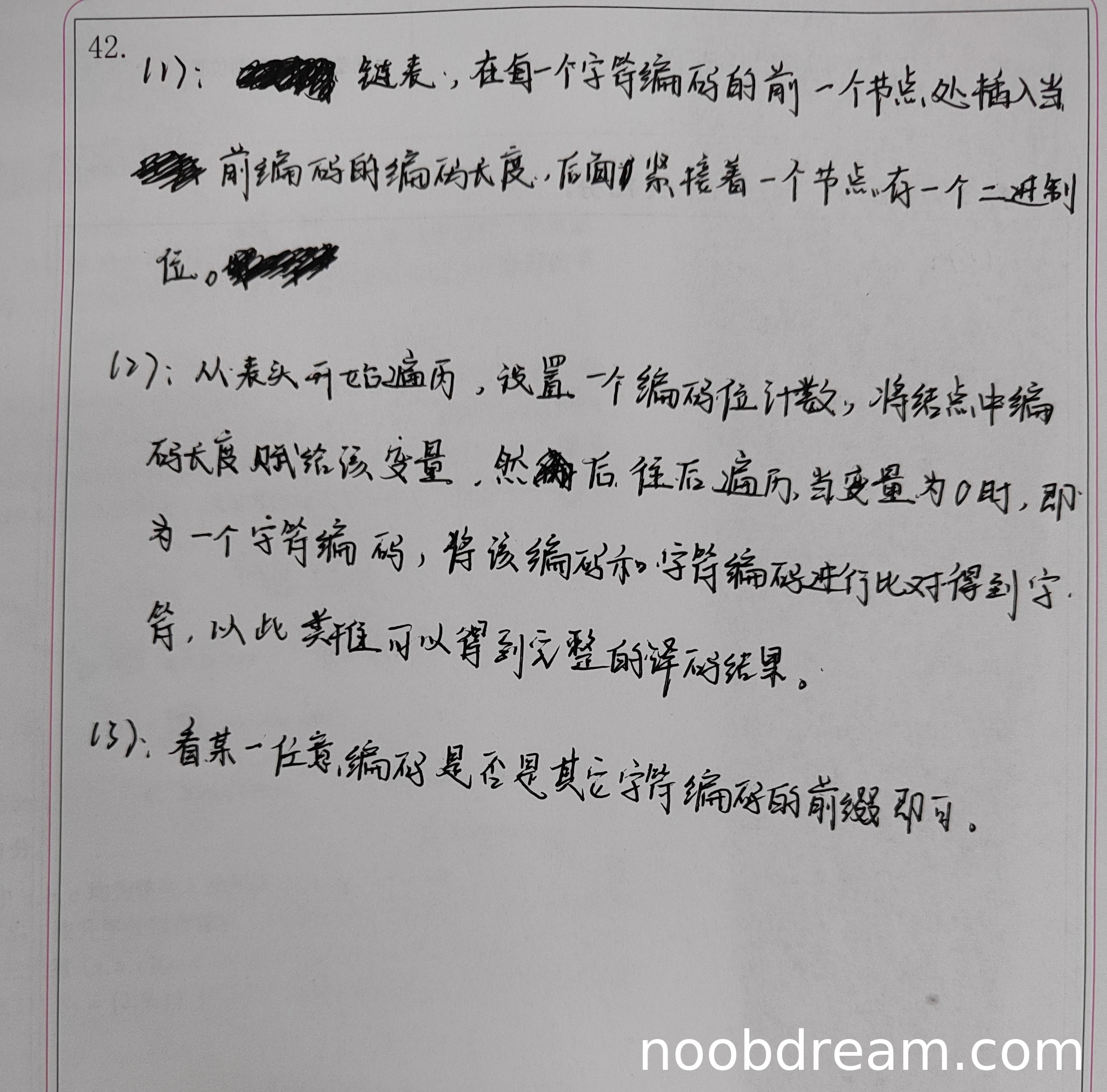 学生描述了一种基于链表的译码过程,通过编码长度计数来分割二进制串。这种方法虽然可以实现译码,但效率较低,且没有利用前缀特性带来的优势。标准答案中基于哈夫曼树的译码过程直接利用树结构进行路径匹配,更为高效和自然。学生的答案思路与标准答案不一致,且方法不够优化,但逻辑上可以完成译码,因此给予部分分数。得分为1分。