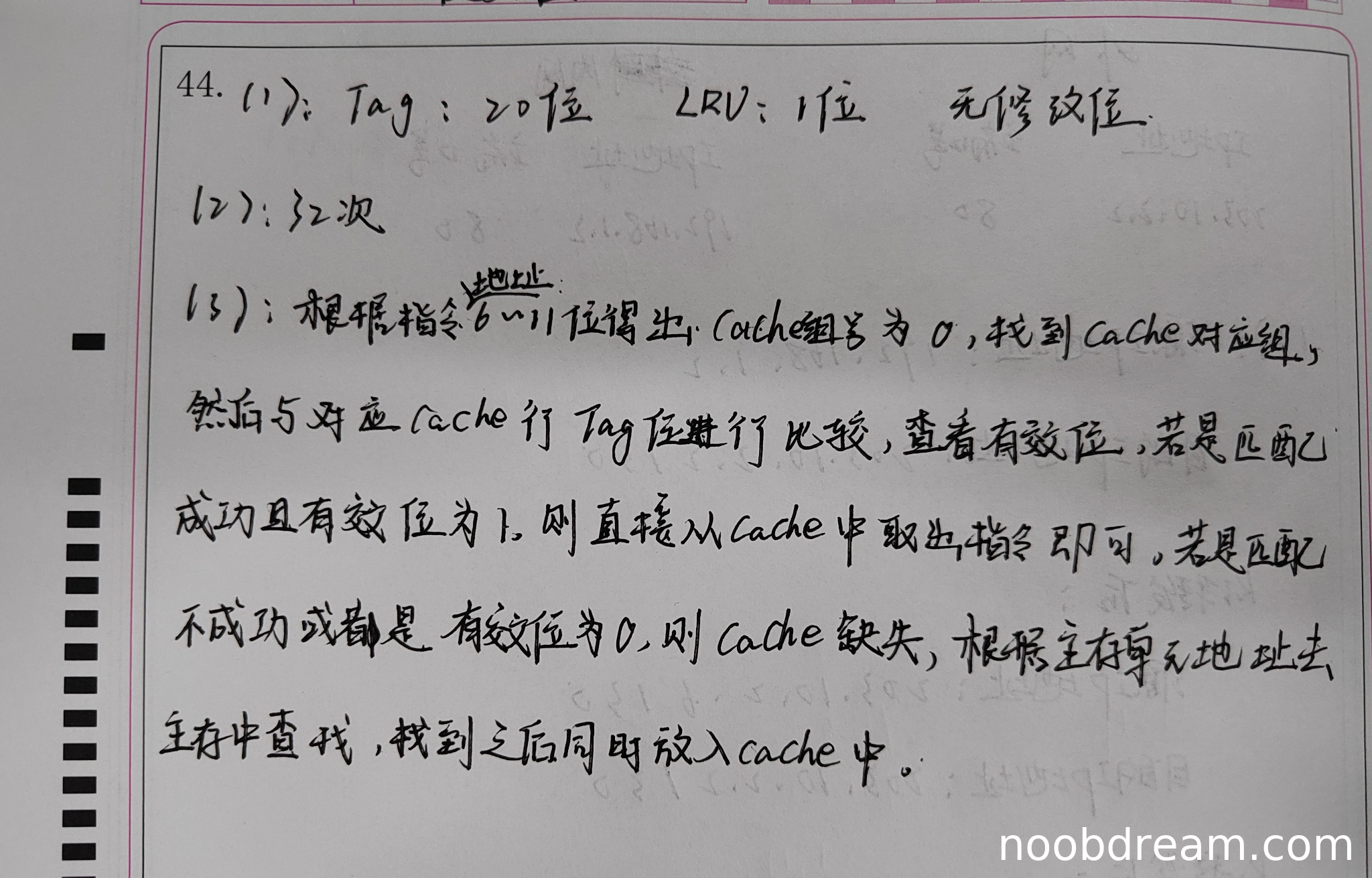 学生答案:Tag为20位,LRU为1位,无修改位。标准答案中Tag为20位正确,LRU位应为3位(因为8路组相联需要log₂8=3位),学生答1位错误;无修改位正确(直写策略不需要修改位)。因此Tag和修改位部分正确,LRU位错误。扣1分,得2分。