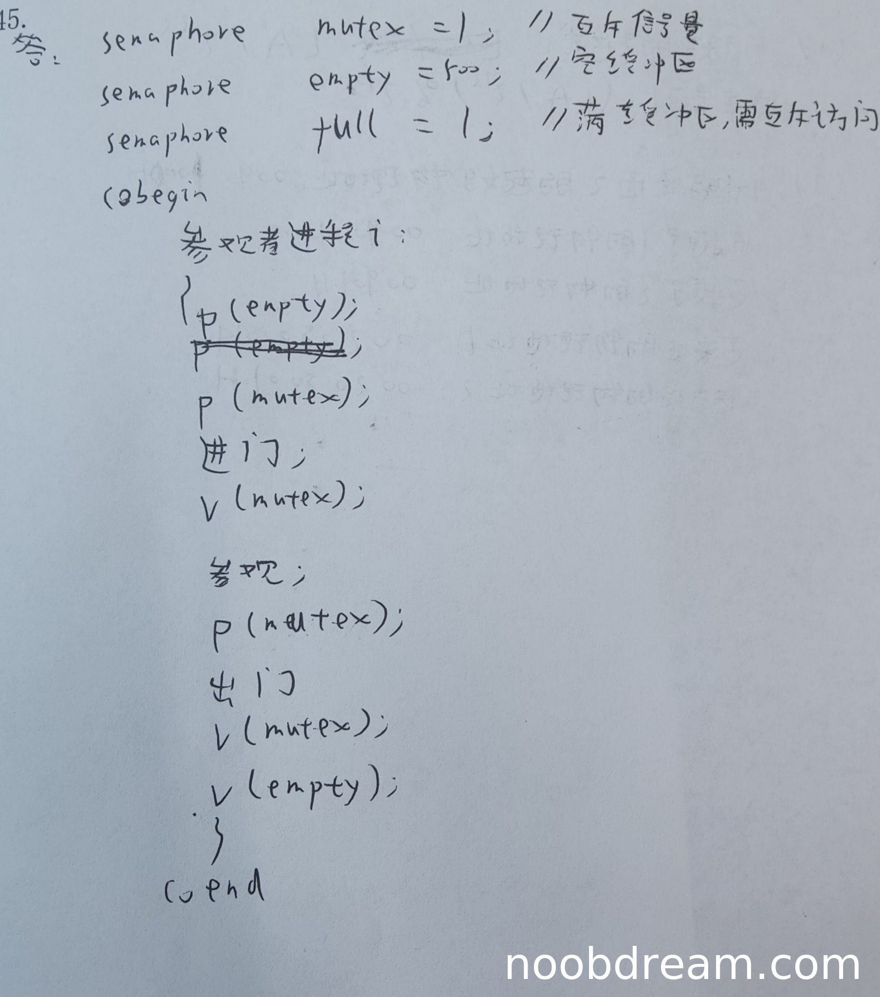 理由:学生对empty的P、V操作完全正确,在进门前P(empty)检查容量,在出门后V(empty)释放容量,逻辑正确。
