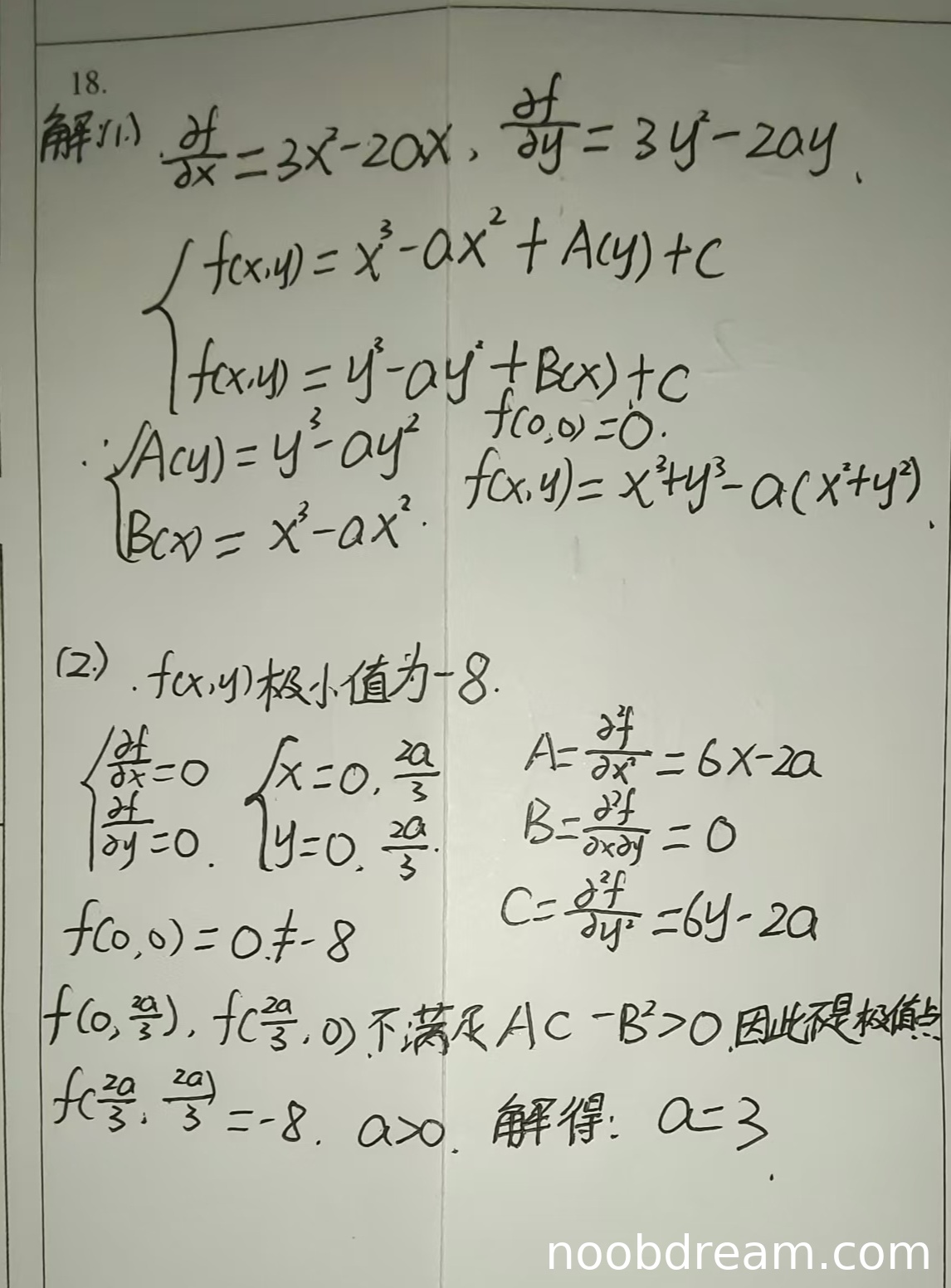 学生通过偏导数积分得到函数表达式,思路正确。但过程中出现了重复表达式和常数处理不严谨的问题:设定了两个积分形式并引入A(y)、B(x)和常数C,但最终正确得出f(x,y)=x³+y³-a(x²+y²)。由于f(0,0)=0验证正确,核心结果正确。扣1分因为过程表述不够严谨。得5分。