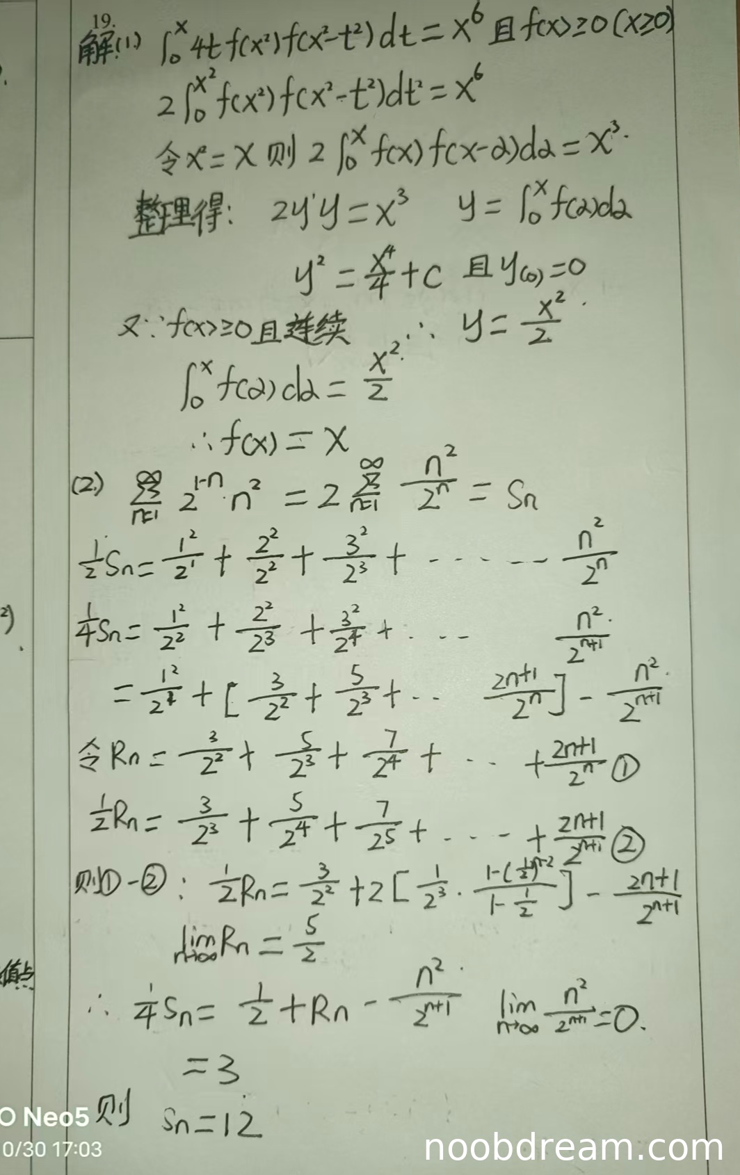 - 学生正确写出所求级数为 \(\sum_{n=1}^{\infty} 2^{1-n} n^2\),并设 \(S_n = 2 \sum_{n=1}^{\infty} \frac{n^2}{2^n}\),但这里符号使用有误(求和下标与变量混淆),实际应为 \(S = \sum_{n=1}^{\infty} \frac{n^2}{2^{n-1}} = 2 \sum_{n=1}^{\infty} \frac{n^2}{2^n}\),学生意图正确,不扣分。