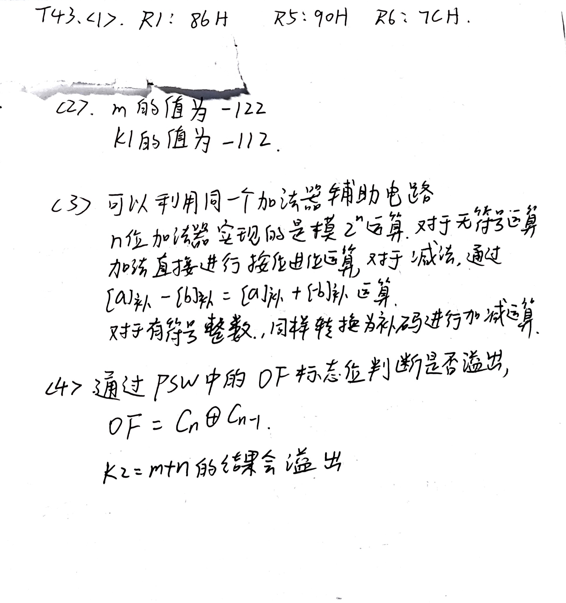 学生答案正确指出了溢出判断方法(OF = Cn⊕Cn-1,即最高位进位与次高位进位异或),并正确识别出k2=m+n会发生溢出。但标准答案要求"计算机内部如何判断带符号整数加/减运算的结果是否发生溢出",学生给出的OF标志位判断是正确方法,但描述中"PSW中的OF标志位"稍显具体,而原理上就是通过最高位进位和符号位进位(即次高位进位)异或来判断,这个原理描述是正确的。学生正确指出了k2溢出,得3分。