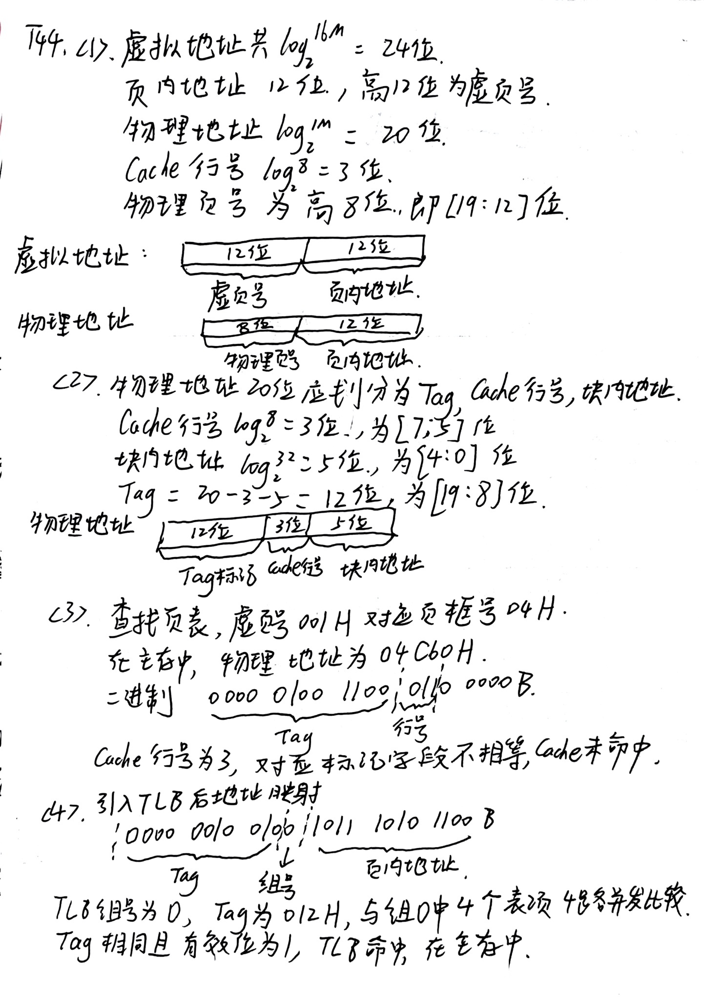 学生正确判断虚拟地址001C60H在主存中(虚页号001H对应页框号04H),物理地址计算正确(04C60H),Cache未命中理由正确(行号3对应标记不匹配)。但学生未明确写出标记字段比较的具体值(标准答案为064H≠04CH),不过核心逻辑正确。扣1分。得3分。