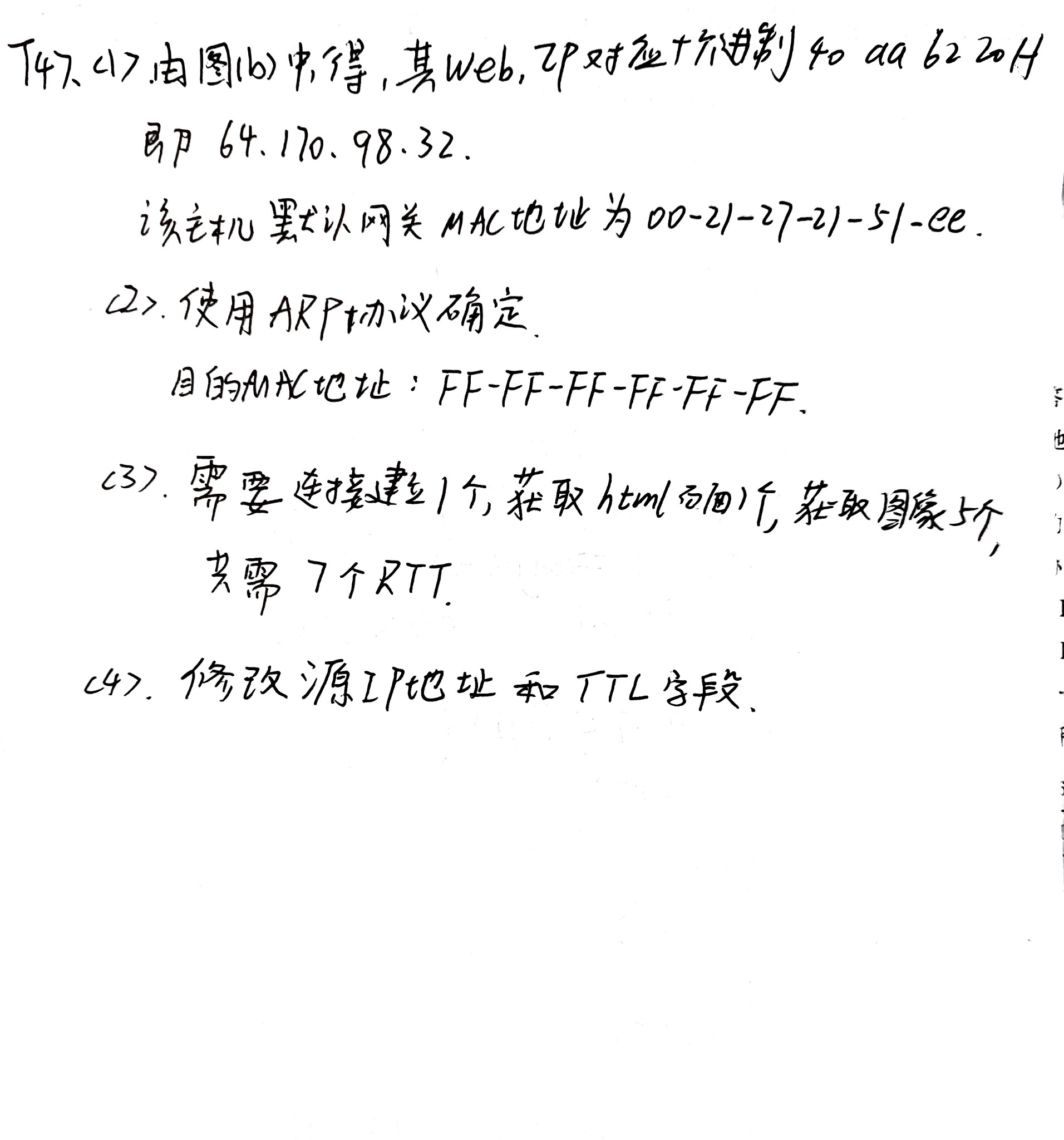 学生正确指出使用ARP协议确定目的MAC地址,并正确指出ARP请求报文的目的MAC地址为广播地址FF-FF-FF-FF-FF-FF,与标准答案完全一致。得2分。