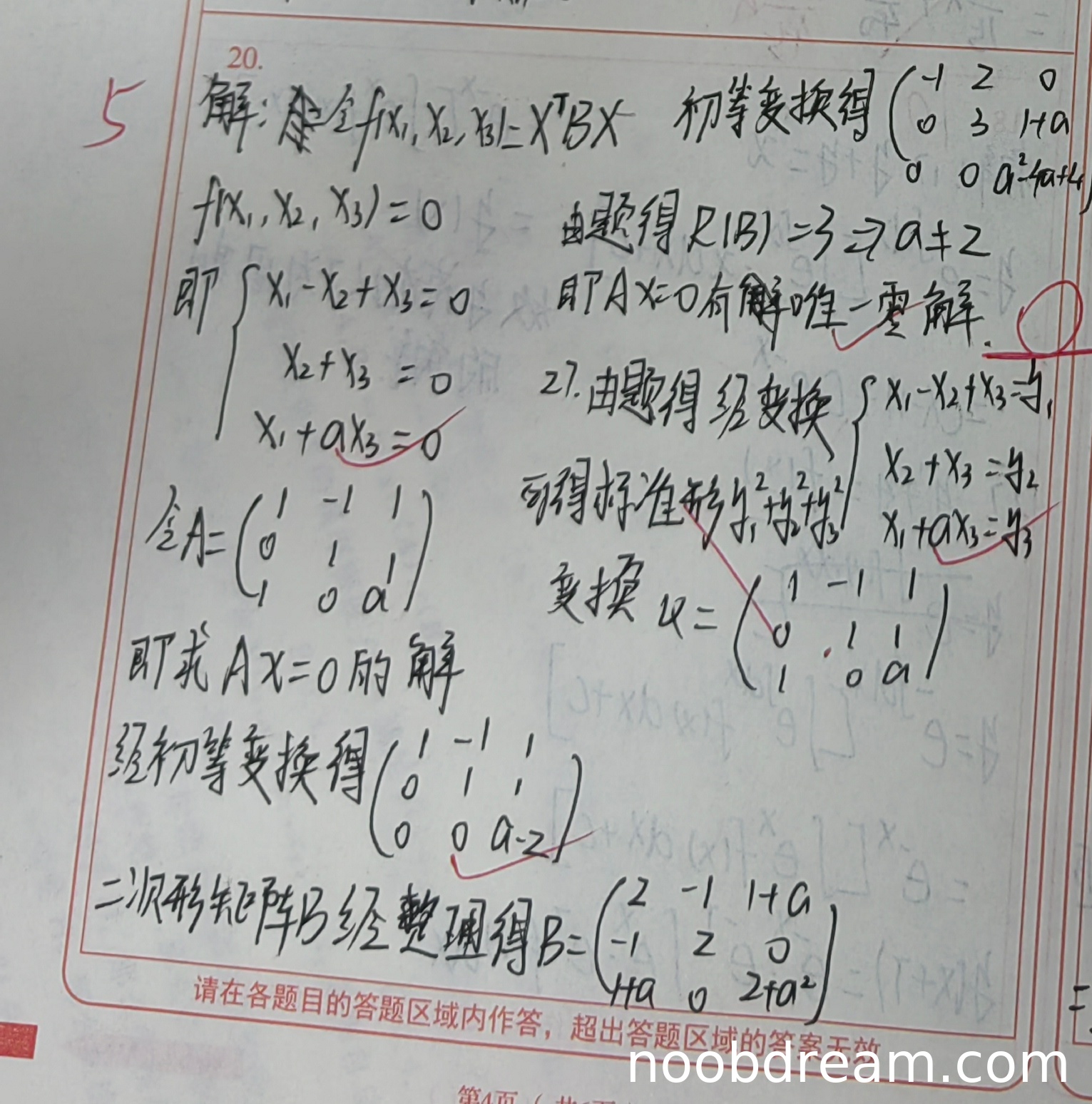 但学生在开头部分写"R(B)=3⇒a≠2"存在逻辑错误,这里B应该是二次型的矩阵,秩为3确实对应a≠2,但这一推理过程不够清晰,且与后面用系数矩阵A求解的方法有些重复。