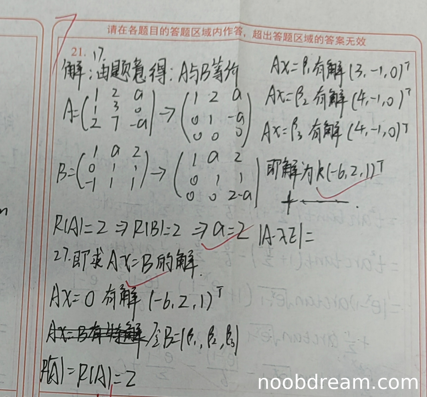 学生正确得出A与B等价,通过秩相等得到r(B)=2,并通过对B进行初等行变换得到阶梯形,由非零行数得出a=2。过程与标准答案一致,逻辑正确。但学生在计算A的秩时写出的行变换结果有误(A变换后第三行应为非零行,但学生写成了零行),不过这不影响a的求解,因为主要依据B的秩。因此扣1分。得4分。