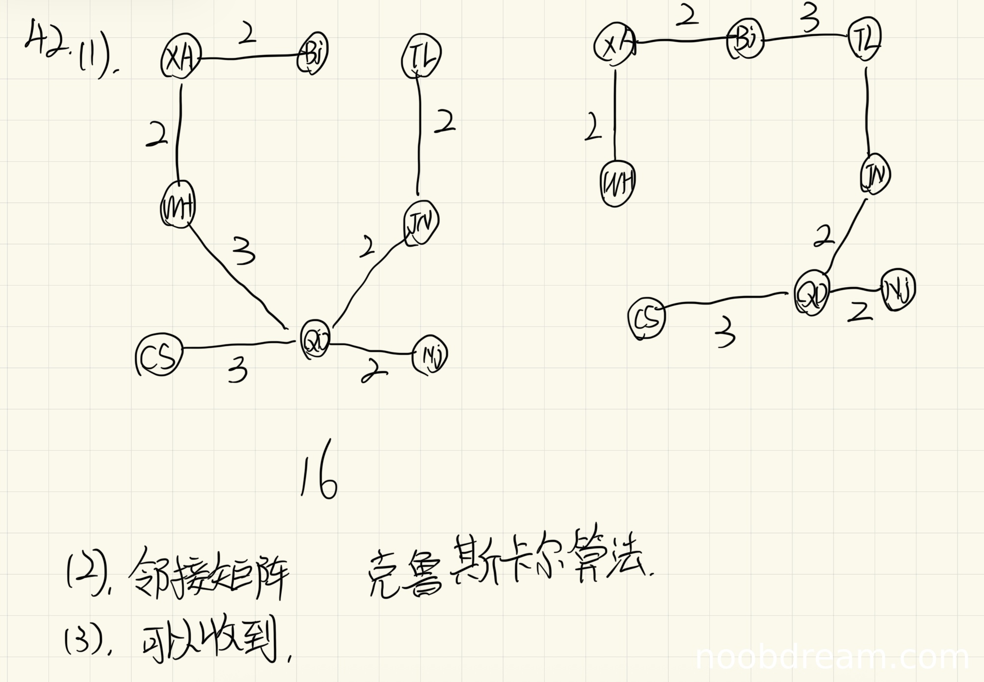 学生给出了两个图结构,并标注总费用为16,这与标准答案中两种最小生成树方案的总费用一致。虽然节点名称存在识别误差(如"Bi"应为"BJ"),但根据上下文可判断为误写,不影响核心逻辑。学生正确计算了最小生成树的总费用并给出了图形表示,因此得4分。