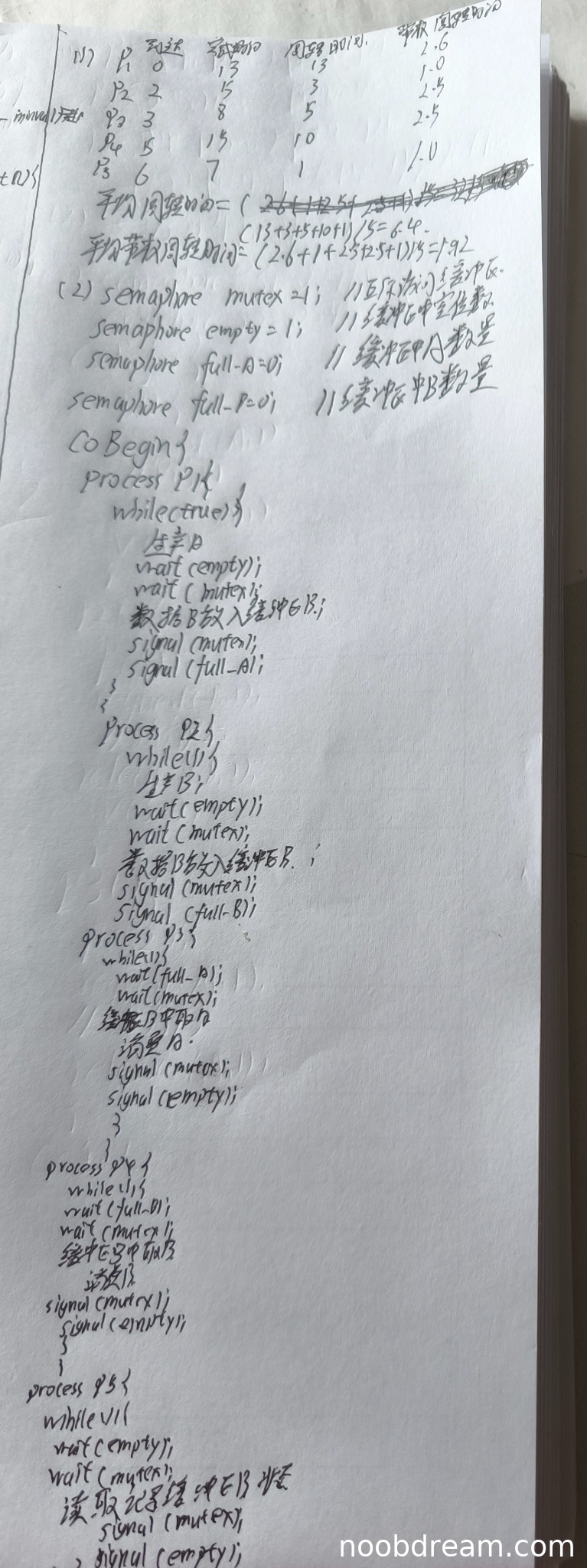 学生答案中进程的周转时间计算有部分错误:P2的完成时间应为5,学生写为15导致周转时间错误(应为3,学生计算为13?但表格中写的是3,可能是识别问题);P4的带权周转时间应为2.5,学生写为2.0。平均周转时间计算过程混乱但结果正确(6.4),平均带权周转时间计算错误(应为1.92,学生得1.82)。由于关键数据错误较多,扣1分。