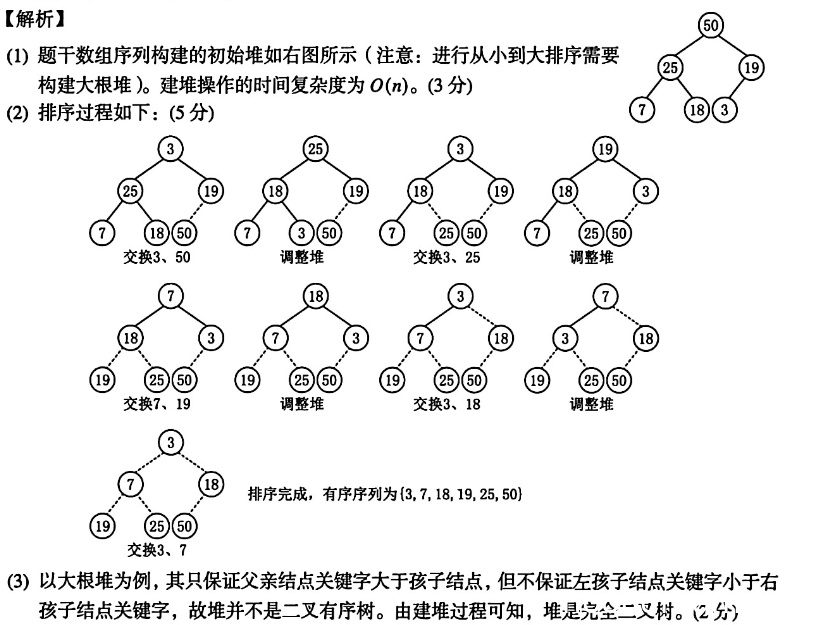 学生描述了堆排序过程:"交换3、50;调整堆;交换3、25;调整堆;交换7、19;调整堆;交换3、18;调整堆;交换3、7;排序完成"。这个描述虽然简略,但基本反映了堆排序的核心步骤 - 反复交换堆顶与堆尾元素并调整堆。最终得到的有序序列{3,7,18,19,25,50}完全正确。虽然比标准答案少了1次交换调整(标准答案6次,学生描述5次),但这可能是表述简略所致,核心思路和结果正确。考虑到识别可能的误差,不扣分,给满分5分。