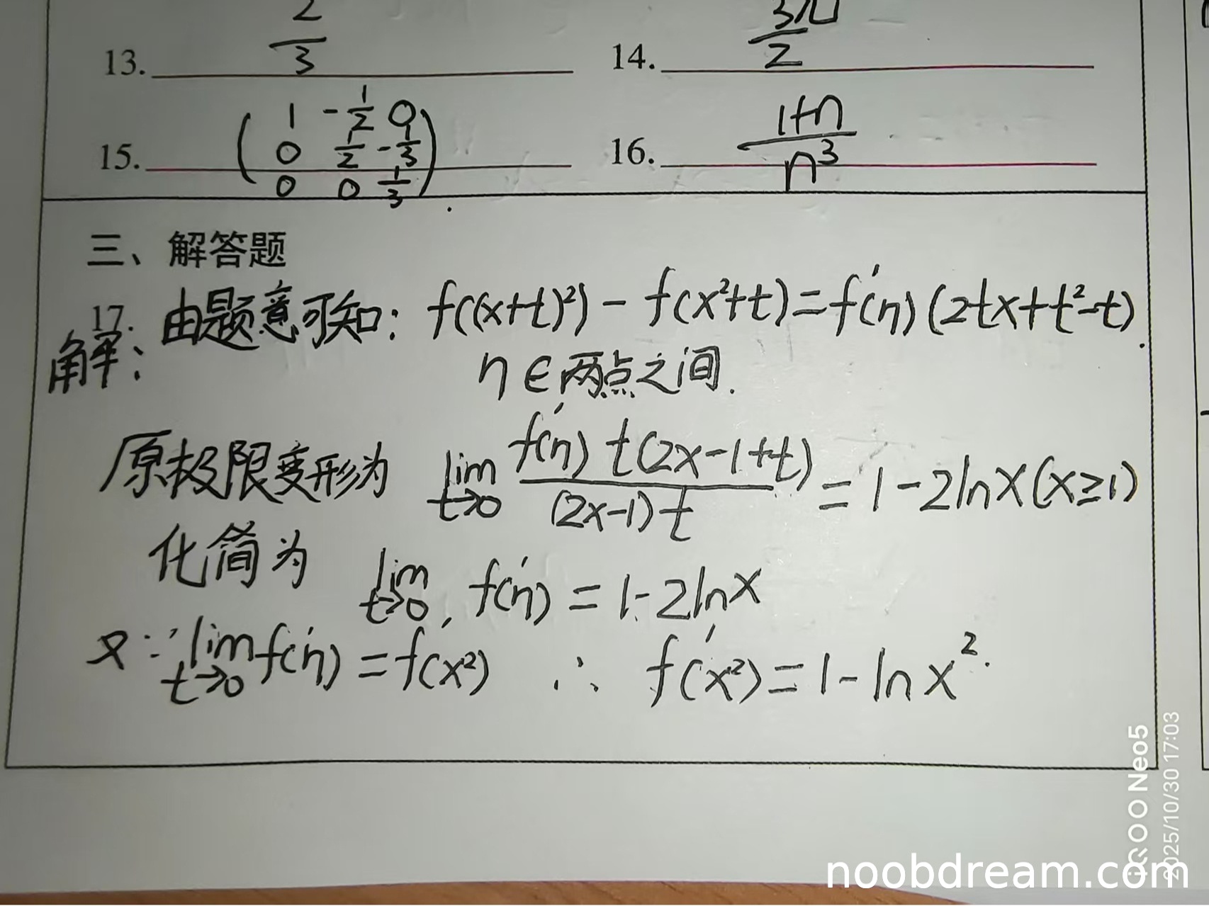 - 关键错误:由lim f'(η) = 1-2lnx 直接得到 f'(x²) = 1-lnx² 这一步逻辑不严谨,缺少必要的推导过程