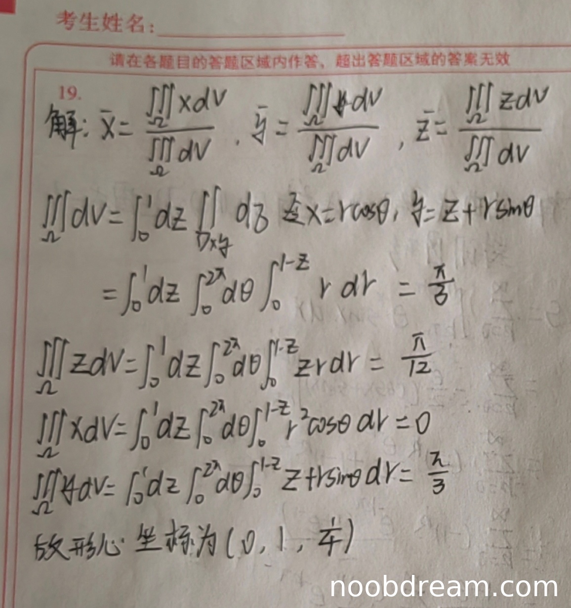 学生计算\(\iiint_{\Omega} y \, dV = \int_{0}^{1} dz \int_{0}^{2\pi} d\theta \int_{0}^{1-z} (z + r\sin\theta) r \, dr\)。积分\(\int_{0}^{2\pi} \sin\theta \, d\theta = 0\),正确部分为\(\int_{0}^{2\pi} z \, d\theta = 2\pi z\),因此积分应为\(\int_{0}^{1} dz \int_{0}^{1-z} 2\pi z r \, dr = \pi \int_{0}^{1} z(1-z)^2 dz = \frac{\pi}{12}\),但学生得到\(\frac{\pi}{3}\),计算错误。扣3分。