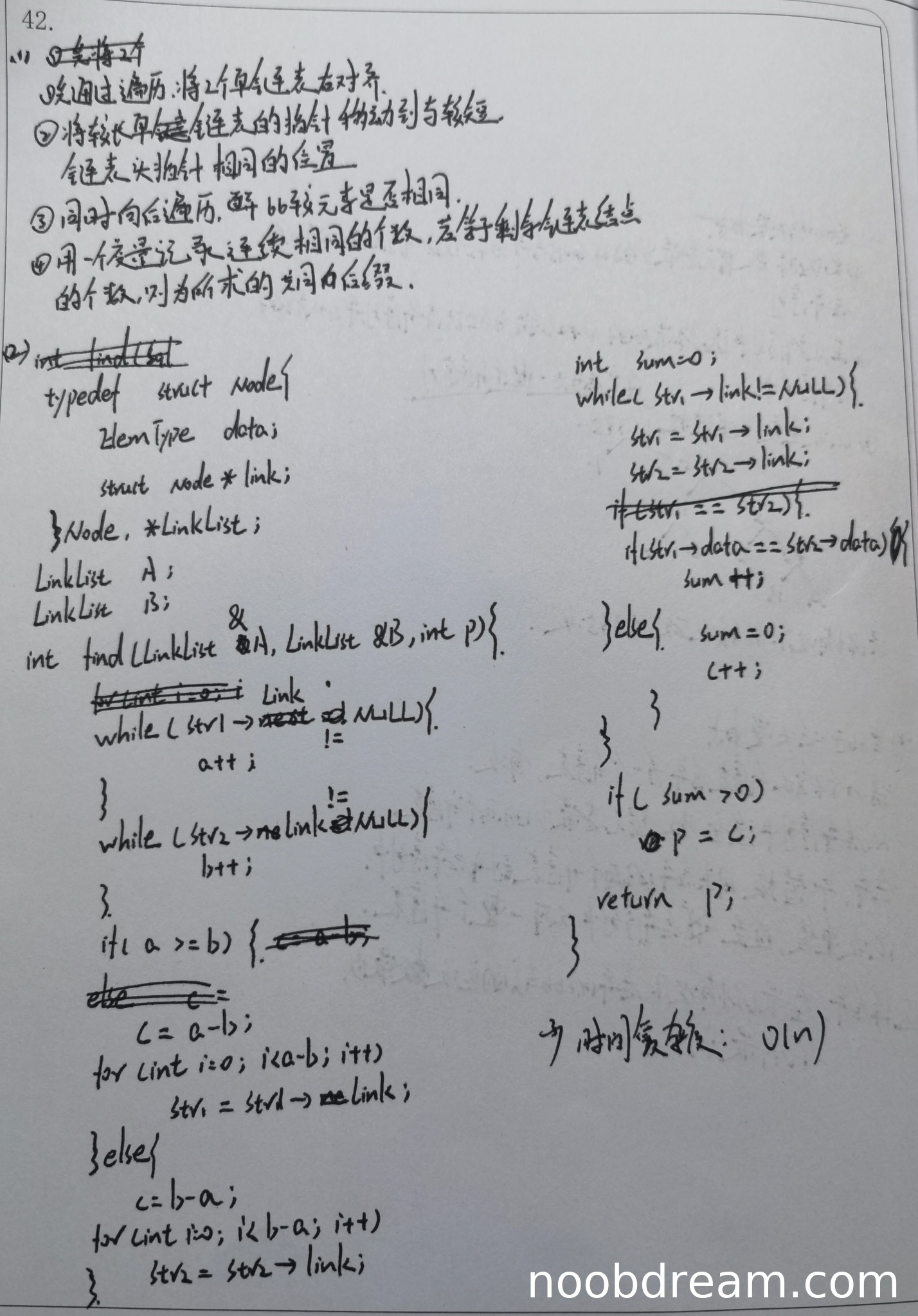 理由:学生回答时间复杂度为O(n),但未明确说明n的含义。实际上算法的时间复杂度应该是O(len1+len2),其中len1、len2分别为两个链表的长度。学生的回答不够准确。