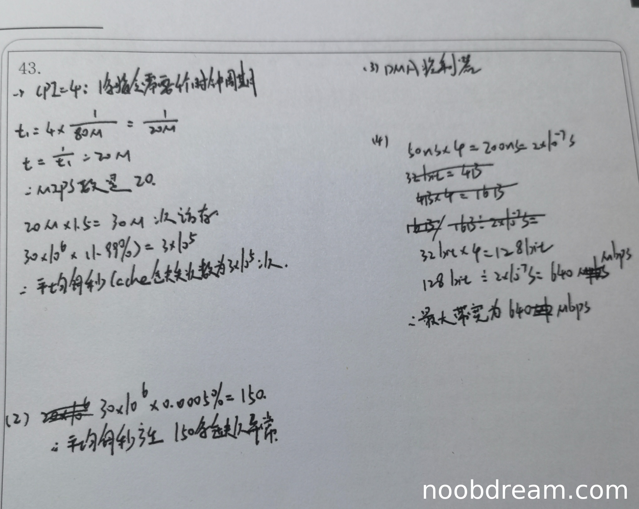 学生计算缺页异常次数为150次,但标准答案为1.5次。计算错误:300k × 0.0005% = 1.5,学生误用30M(总访存次数)而非300k(Cache缺失次数)计算,逻辑错误扣1分;未计算DMA请求次数,扣1分。本小题得0分。