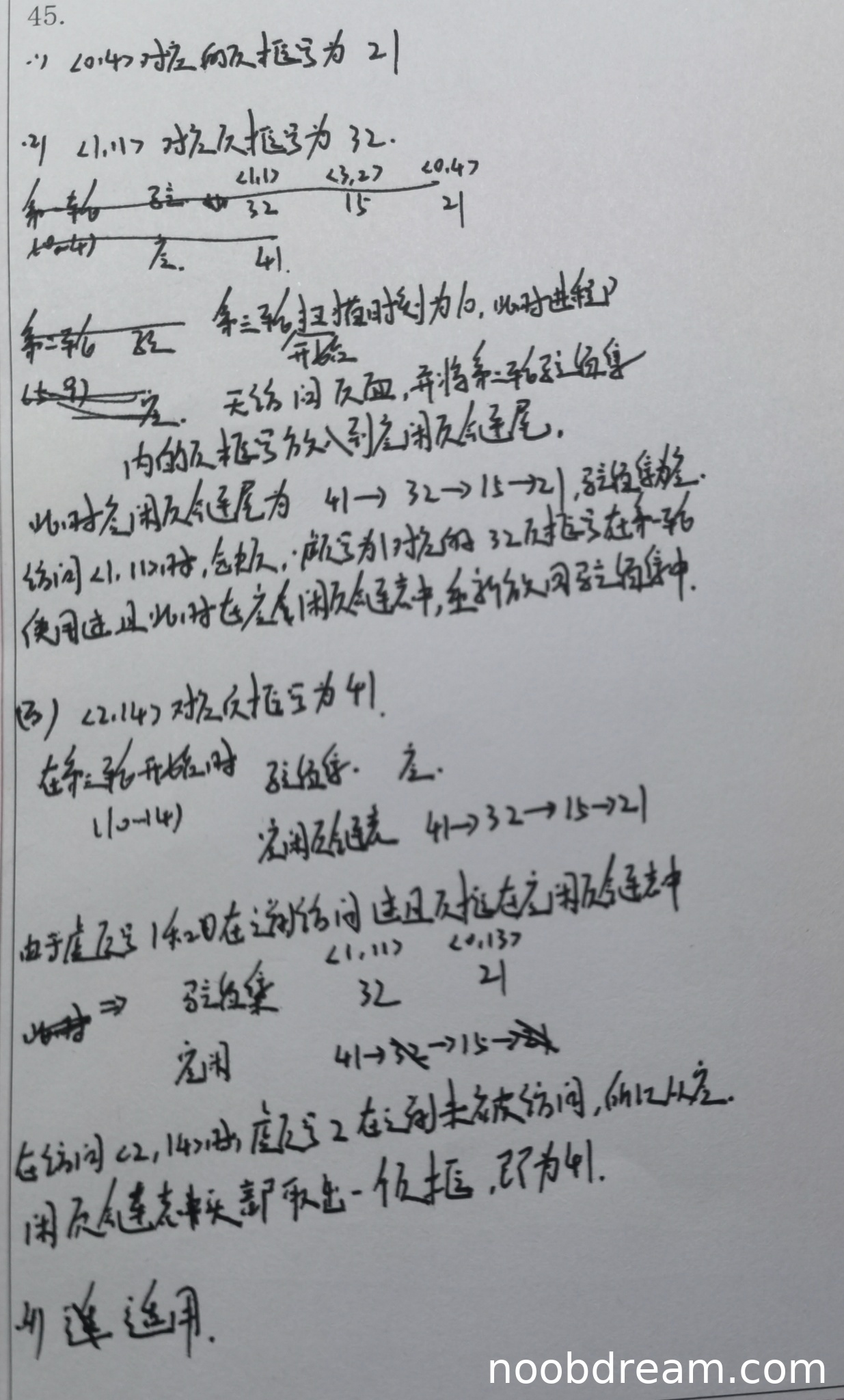 学生答案正确,页框号为32。理由部分基本正确,但表述存在一些混乱(如"第三轮扫描时刻为10,此时进程开始"不够准确),不过核心逻辑正确:在第二轮扫描后页框32被回收,访问<1,11>时该页在空闲链表中,因此重新放回驻留集。得2分。