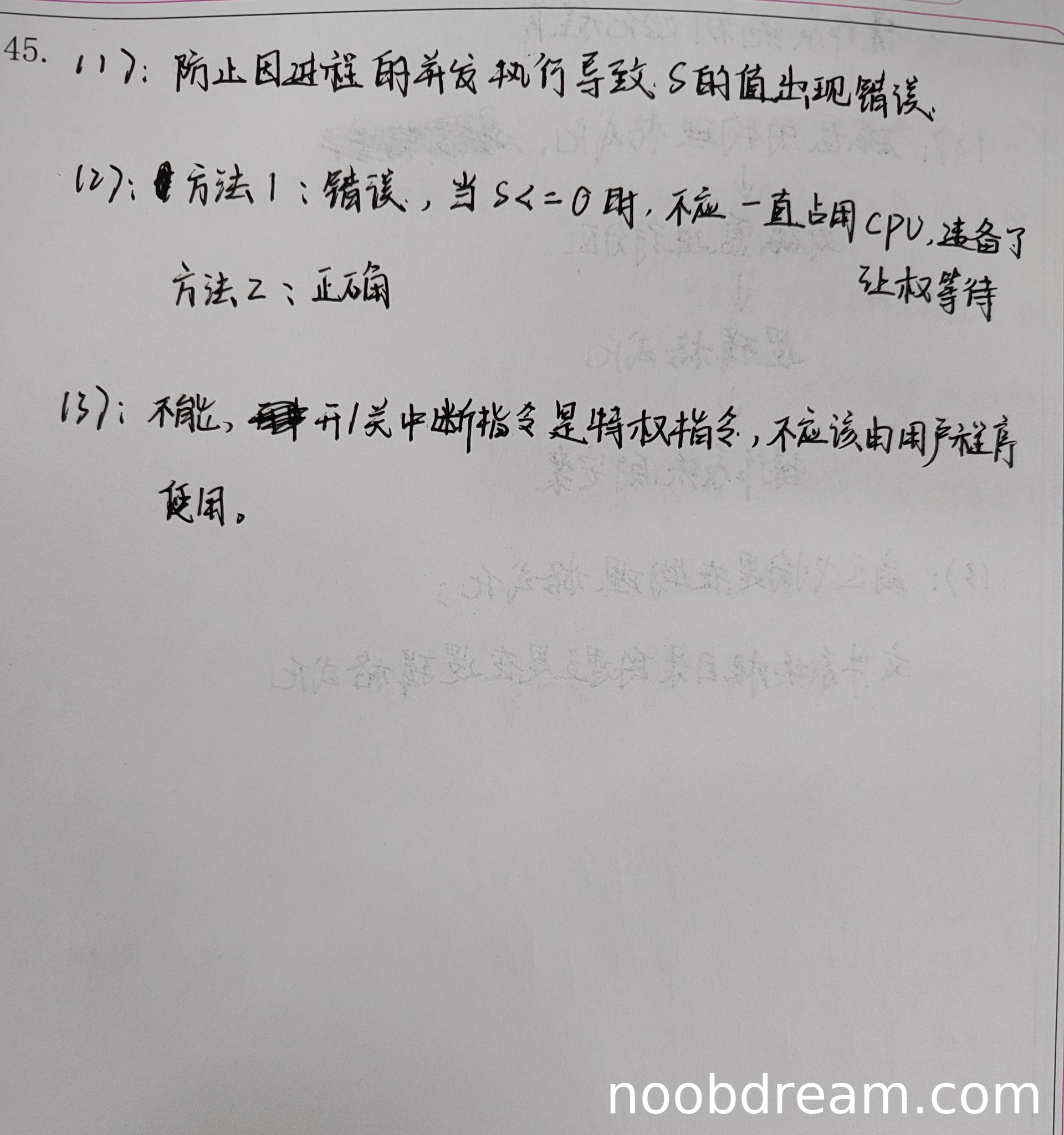 学生判断方法1错误、方法2正确,与标准答案一致。对于方法1的错误理由,学生说"不应一直占用CPU,应准备了让权等待",虽然表述与标准答案不完全相同,但意思基本正确,都指出了方法1会导致死循环问题。给3分。