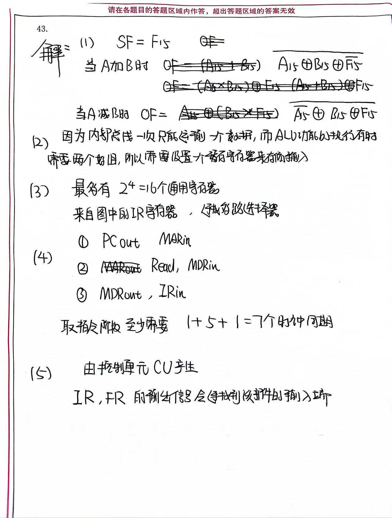 第一问SF=F15正确,得1分。第二问A加B的OF逻辑表达式,学生给出的表达式不标准,但思路基本正确,但表述不清晰,扣0.5分。A减B的OF逻辑表达式同样不标准,扣0.5分。本小题共得2分。