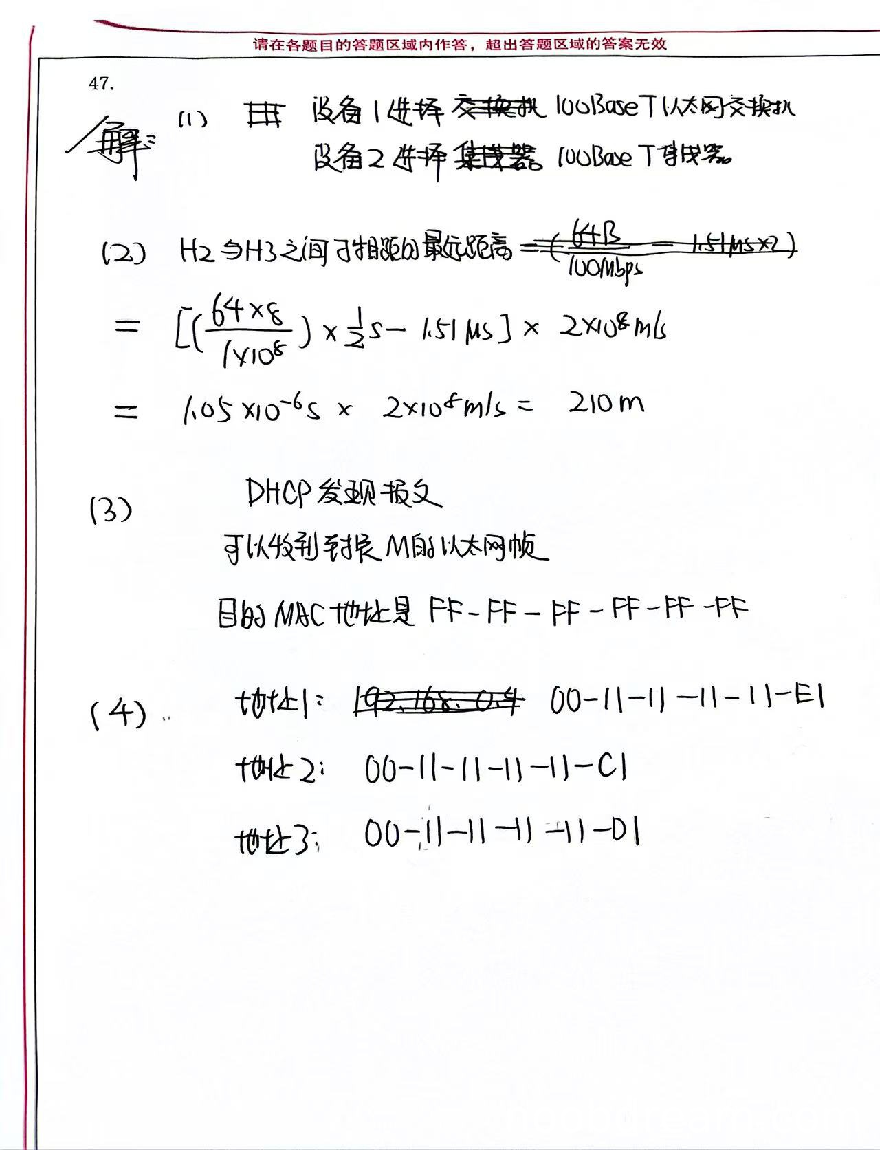 学生答案正确指出设备1为100Base-T以太网交换机,设备2为100Base-T集线器,与标准答案完全一致。根据题目描述,H1与H2属于同一广播域但不同冲突域,说明设备1需要隔离冲突域(交换机功能);H2与H3属于同一冲突域,说明设备2不能隔离冲突域(集线器功能)。学生答案逻辑正确,得2分。