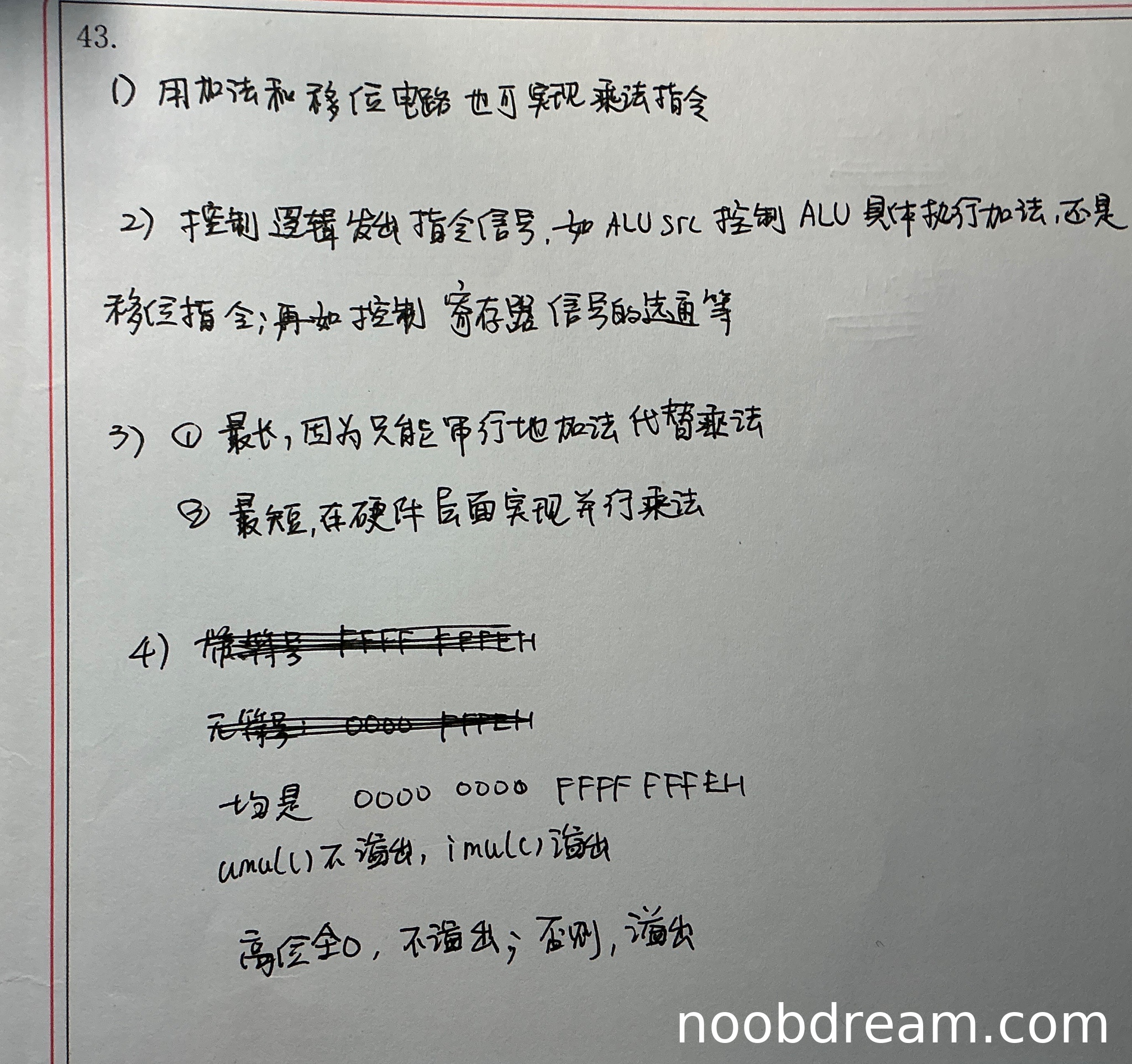 学生回答"用加法和移位电路也可实现乘法指令",正确指出了乘法可以通过加法和移位实现,与标准答案思路一致。得2分。