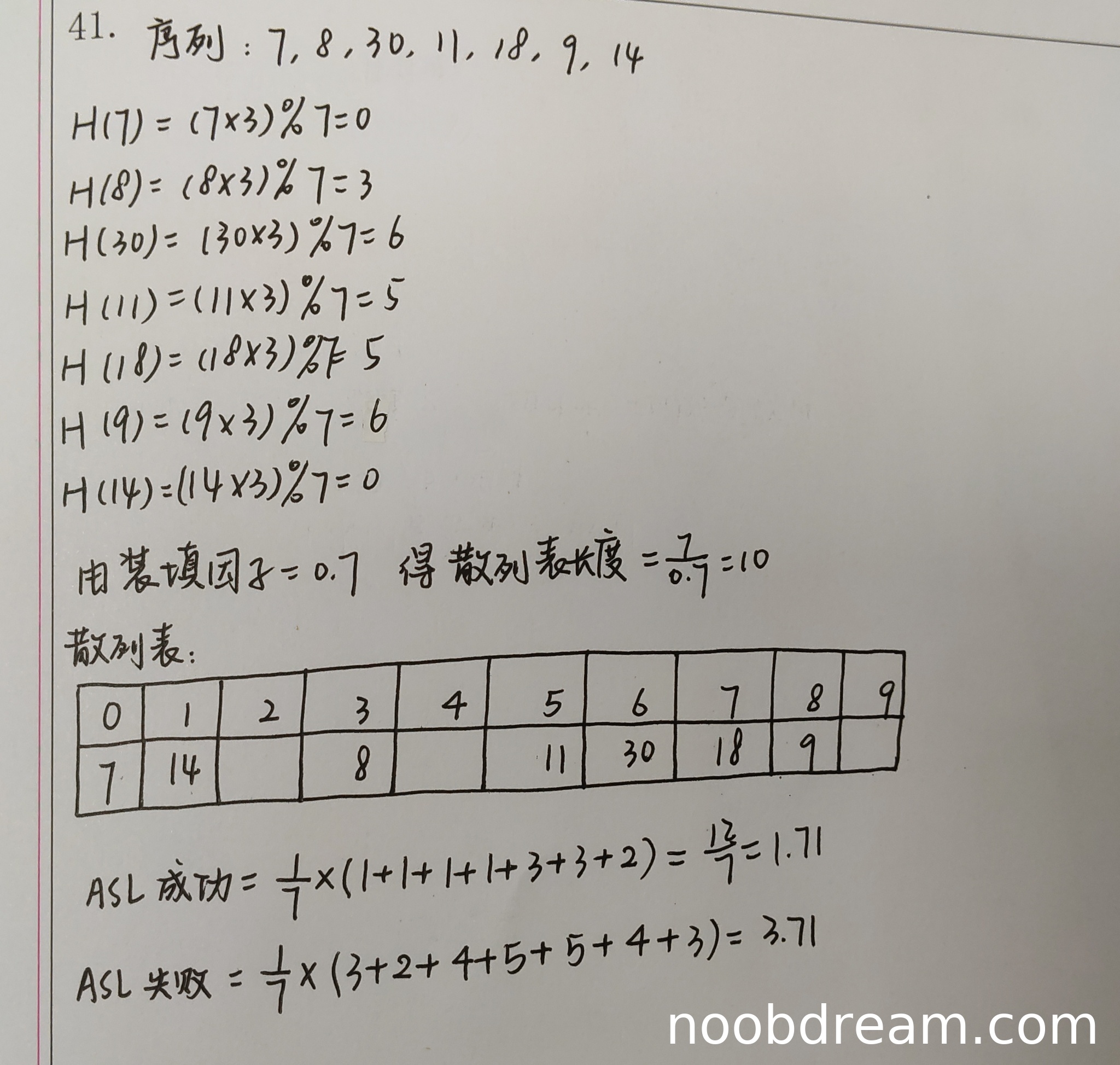学生正确计算了散列函数值,确定了散列表长度为10(7/0.7=10),并正确使用线性探测法处理冲突构建了散列表。表格内容与标准答案完全一致:0号位置为7,1号位置为14,3号位置为8,5号位置为11,6号位置为30,7号位置为18,8号位置为9,其余位置为空。得6分。