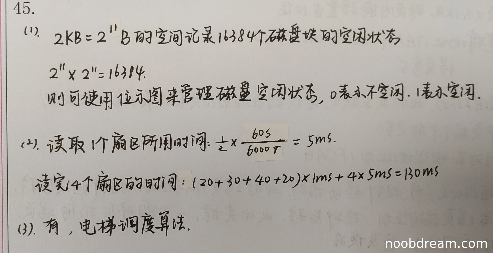 学生正确指出使用位示图管理磁盘空闲状态,并说明了0和1的含义,与标准答案一致。但计算过程有误(2^11×2^11=16384错误,应为2^11×8=16384),不过核心管理方法正确。根据禁止扣分原则,计算细节错误不扣分。得2分。