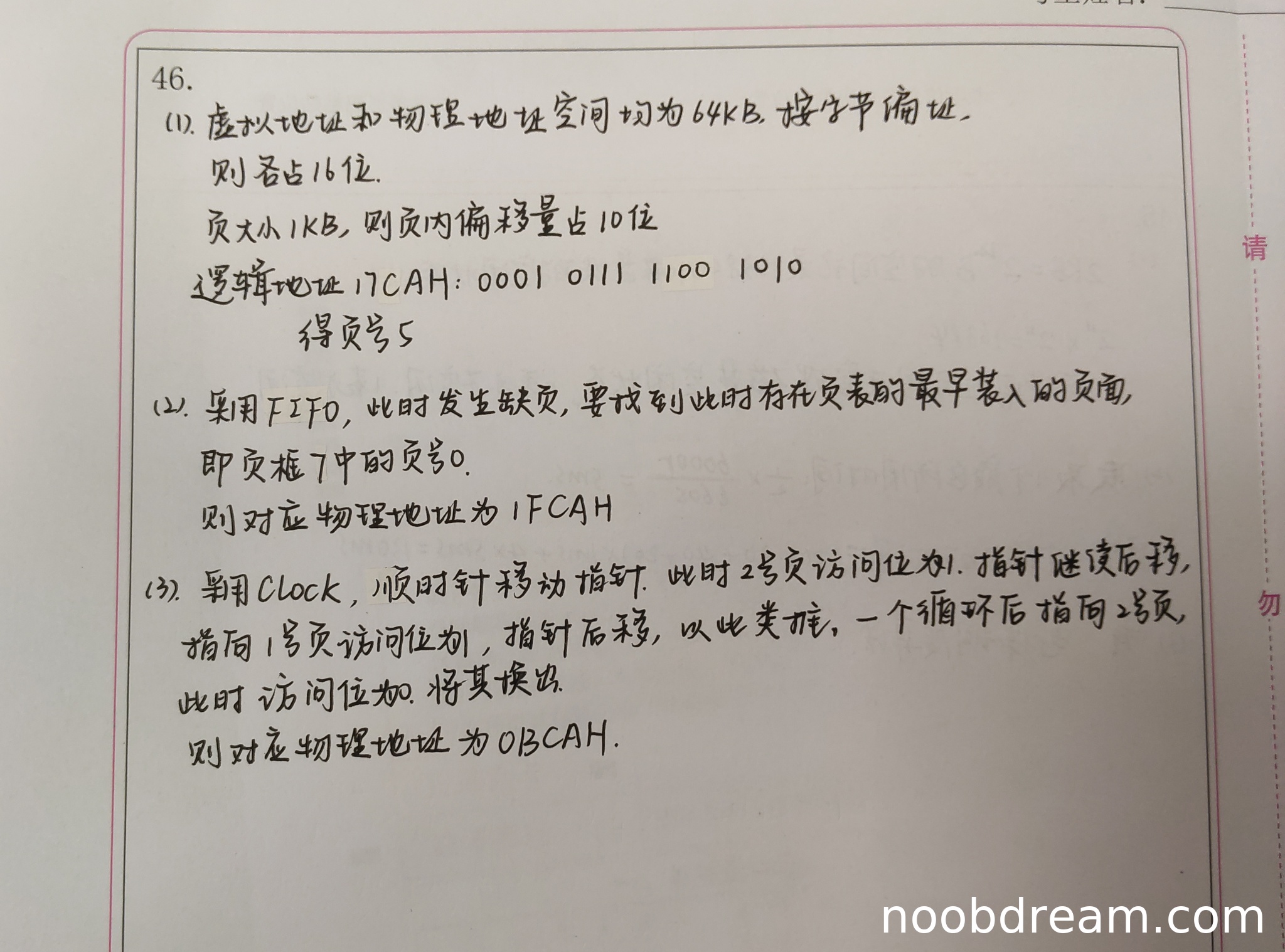 学生正确指出FIFO算法置换最早装入的页(页号0,位于页框7),并得出物理地址1FCAH,计算过程与标准答案一致。得3分。