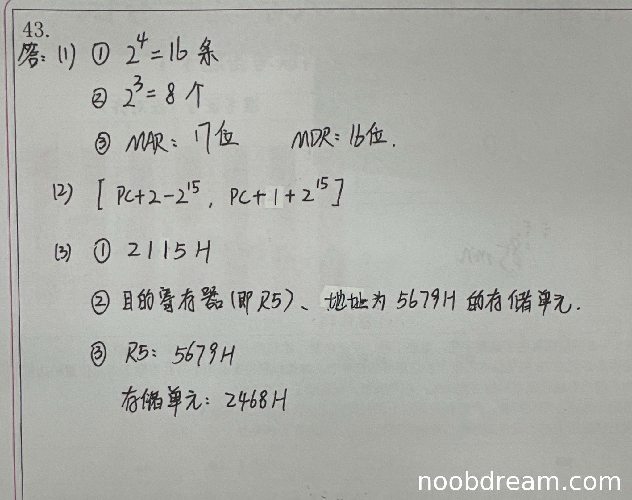 学生答案:目标地址范围[PC + 2 - 2¹⁵, PC + 1 + 2¹⁵]错误。相对偏移量为8位补码(范围-128~+127),按字编址,偏移量应左移1位(×2),实际地址范围应为[PC+2-256, PC+2+254]。学生未考虑编址方式且表达式错误。