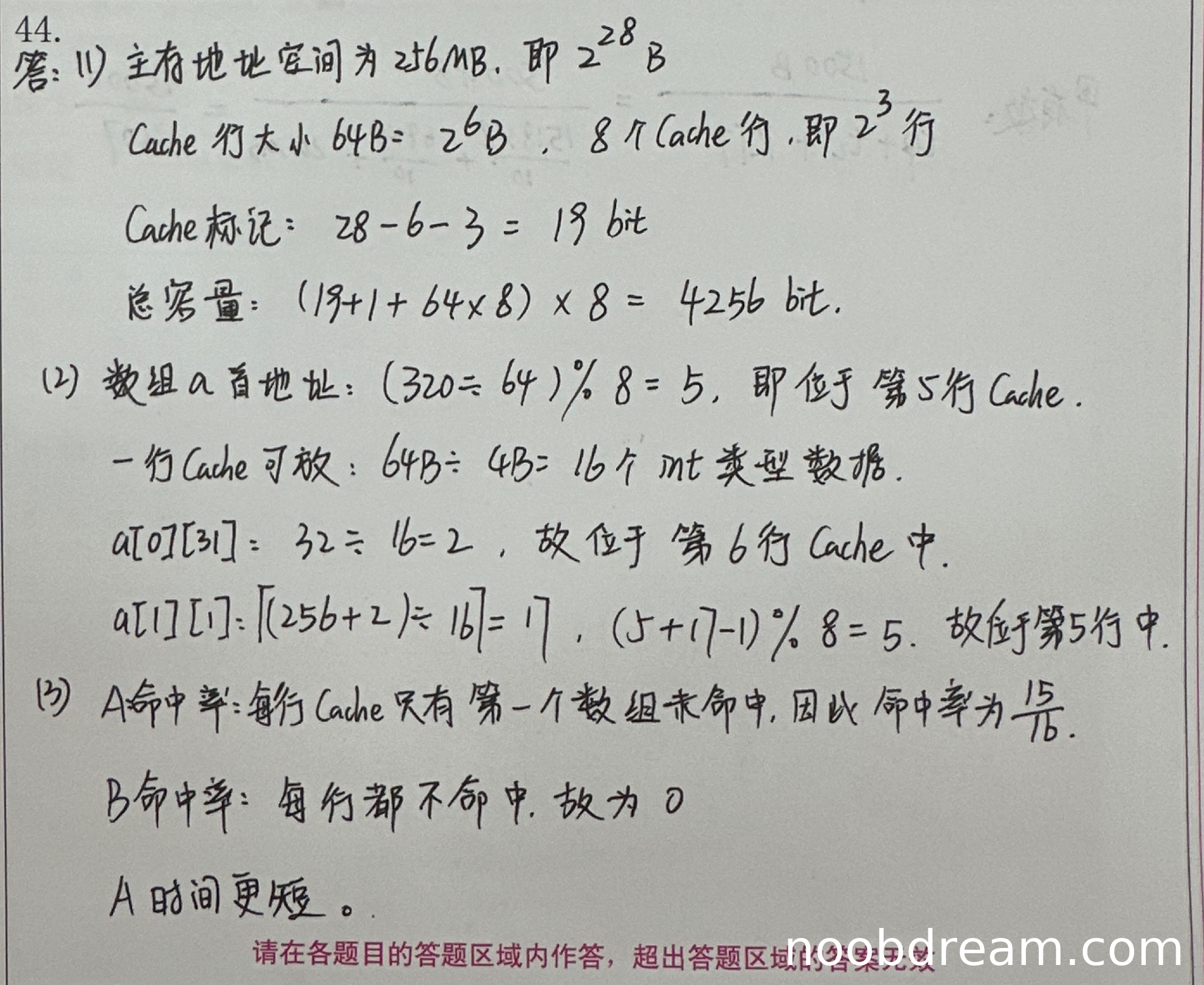 学生正确分析出程序A的命中率为15/16,程序B的命中率为0,并指出A时间更短,与标准答案一致。但未详细说明理由,扣1分。得4分。