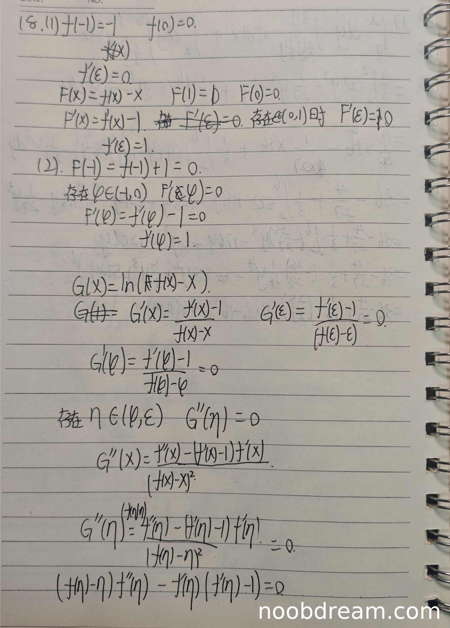 学生作答中,第一部分试图证明存在ξ∈(0,1)使得f'(ξ)=1。标准答案通过构造F(x)=f(x)-x,利用f(0)=0和f(1)=1(题目条件)得到F(0)=F(1)=0,应用罗尔定理得出结论。学生虽然正确构造了F(x)=f(x)-x,但错误地使用了条件f(1)+f(-1)=-1(题目中无此条件,应为误写),且推导过程中出现f'(ξ)=0的错误结论。但学生最终得到了f'(φ)=1的正确结论,且使用了罗尔定理的基本思路。考虑到核心逻辑基本正确,但存在条件误用和中间推导错误,扣2分。