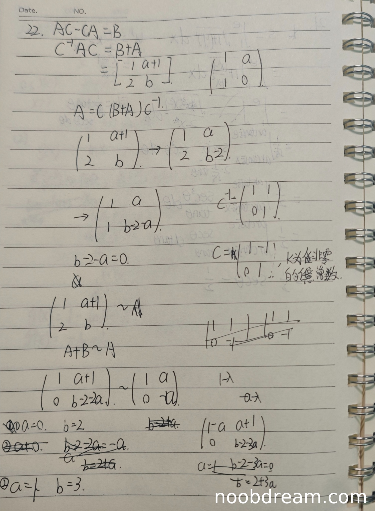 学生作答存在严重的逻辑错误。首先,从AC - CA = B直接推出C⁻¹AC = B + A是不成立的,因为矩阵乘法不满足交换律,且这里C可能不可逆。其次,学生假设了C⁻¹的具体形式,这是没有依据的。整个推导过程与标准解法(转化为线性方程组求解)完全不同,且最终得出的a、b条件(b = 2 + a)与正确答案(a = -1, b = 0)不符。虽然学生尝试了矩阵相似和初等变换的思路,但基础逻辑错误导致结论完全错误。因此,本题不能得分。