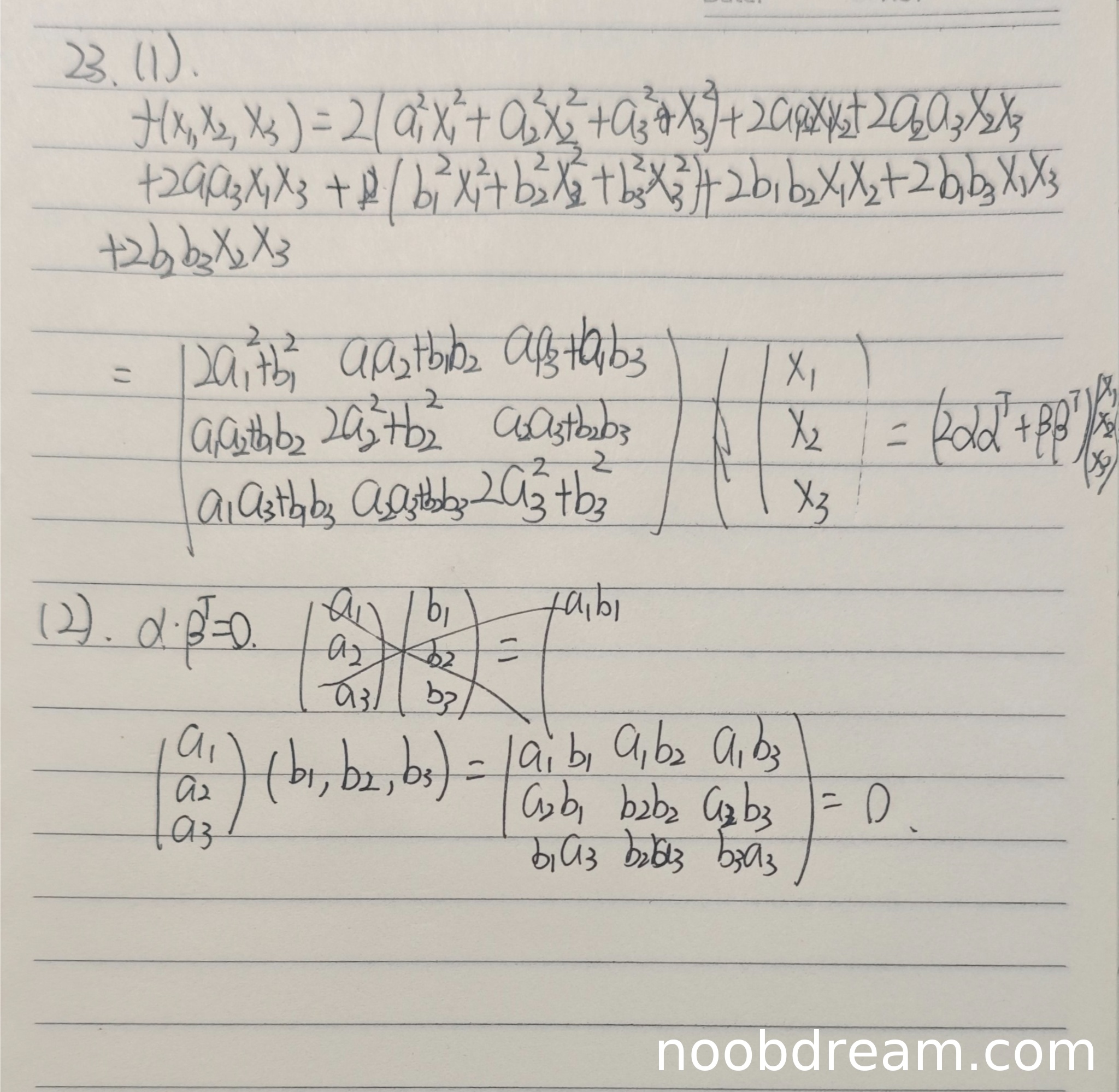 学生通过展开二次型并整理成矩阵形式,正确推导出二次型对应的矩阵为 \(2\alpha\alpha^{T}+\beta\beta^{T}\)。虽然标准答案中写的是 \(2\alpha^{\top}\alpha+\beta^{\top}\beta\),但考虑到 \(\alpha\) 和 \(\beta\) 是列向量,\(\alpha\alpha^{T}\) 与 \(\alpha^{\top}\alpha\) 是等价的(都是3×3矩阵),因此这里不视为错误。推导过程完整,逻辑正确。得5分。