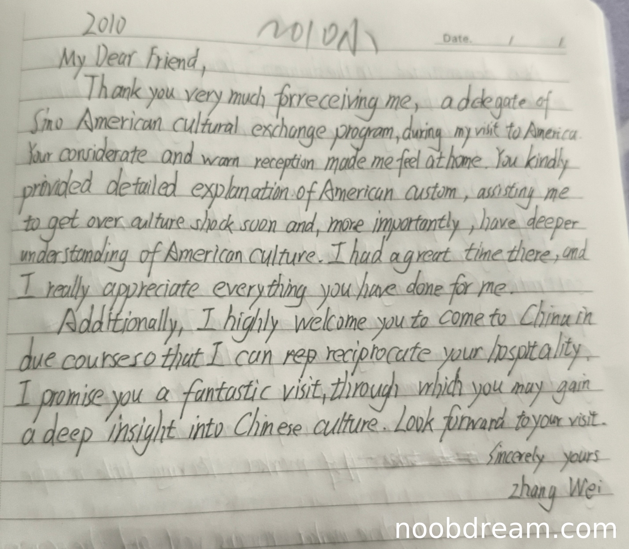 该信件内容完整覆盖题目要求的两个要点:表达感谢和欢迎来访。语言自然流畅,使用了"considerate and warm reception"、"reciprocate your hospitality"等恰当表达,语法错误极少。格式正确,包含称呼、正文、结束语和签名,语域恰当(正式友好)。逻辑清晰,段落衔接自然。符合第五档(9-10分)标准。考虑到极少量可改进之处(如"2010"可能是误写),给予9分。