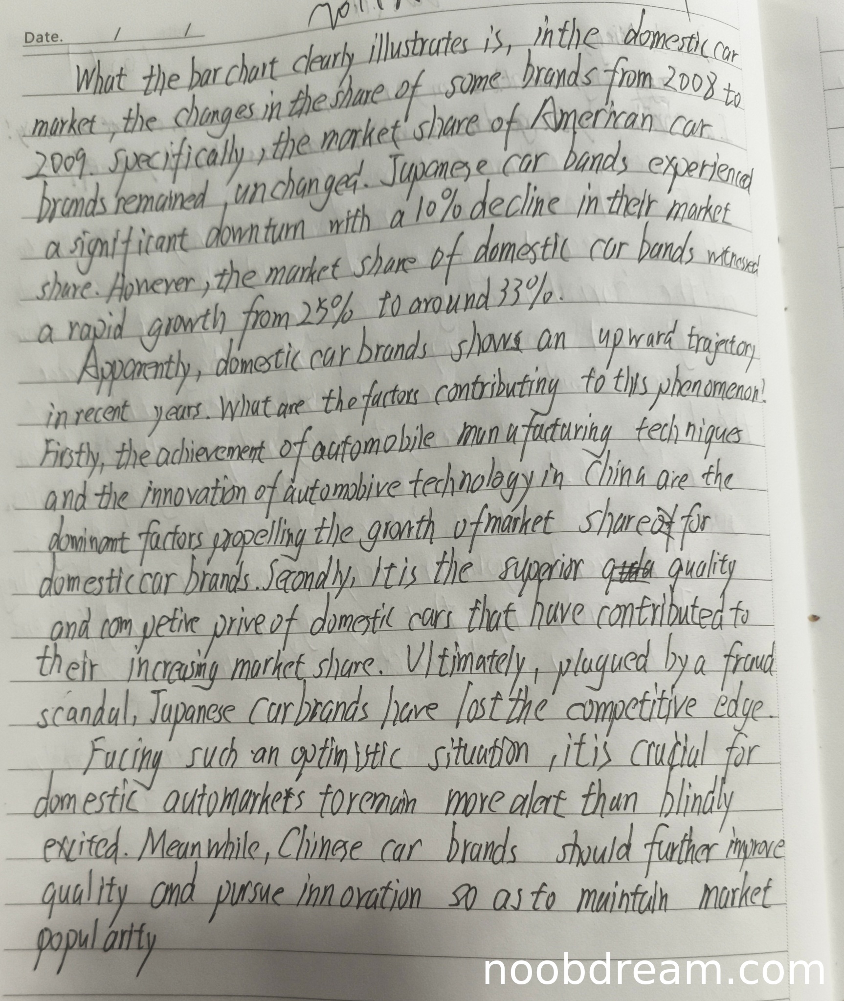 理由:该作文很好地完成了图表解读任务。第一段准确描述了2008-2009年三大汽车品牌市场份额的变化趋势:国产品牌从25%增长到约33%,日系品牌下降10%,美系品牌保持不变。第二段提供了合理的评论分析,包括技术进步、质量价格优势和日系品牌丑闻等因素。第三段给出了恰当的建议。内容要点完整,符合题目要求。