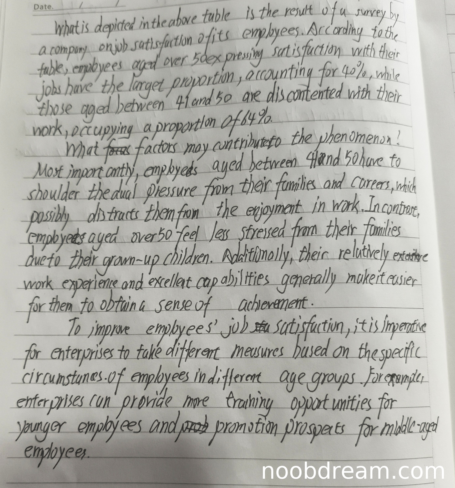 得分:6.5分。理由:学生较好地完成了图表描述任务,准确指出了50岁以上员工满意度最高(40%)和41-50岁员工不满意度最高(64%)这两个关键数据。但漏掉了≤40岁组"不清楚"占比50%这一重要数据,对"不清楚"群体的整体分析不足。评论部分能结合不同年龄段特点展开分析,内容要点覆盖较全面。