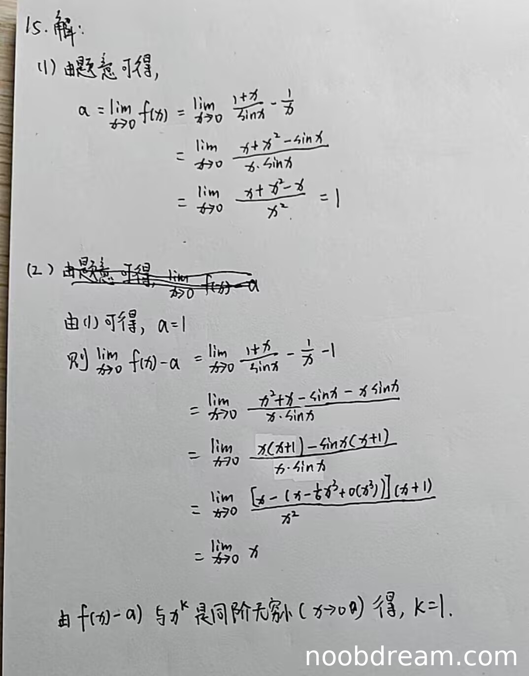 学生作答中,第一步计算极限a的过程存在逻辑错误。在化简过程中,学生将分子中的 \(x + x^2 - \sin x\) 直接替换为 \(x + x^2 - x\),即错误地将 \(\sin x\) 替换为 \(x\),但忽略了高阶无穷小项,导致计算过程不严谨。虽然最终结果a=1正确,但推导过程存在错误。根据评分标准,逻辑错误需要扣分。考虑到结果正确,但过程有误,扣2分。得分为3分。