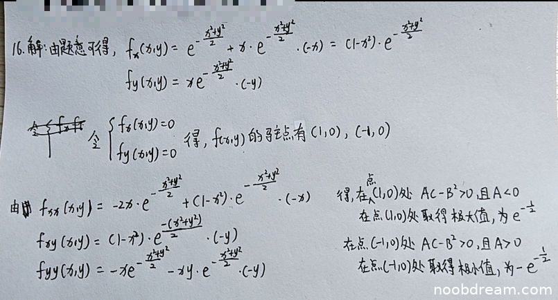 学生正确计算了偏导数 \( f_x \) 和 \( f_y \),并正确求解了驻点 \((1,0)\) 和 \((-1,0)\)。在二阶偏导数的计算中,学生给出了 \( f_{xx} \)、\( f_{xy} \)、\( f_{yy} \) 的表达式,虽然 \( f_{yy} \) 的表达式与标准答案形式不同,但经过验证在驻点处的值是一致的。学生正确应用了极值的充分条件,在 \((1,0)\) 处判断 \( AC-B^2>0 \) 且 \( A<0 \),为极大值;在 \((-1,0)\) 处判断 \( AC-B^2>0 \) 且 \( A>0 \),为极小值,并给出了正确的极值。整个过程逻辑清晰,计算正确。扣分项:无。得分:10分。