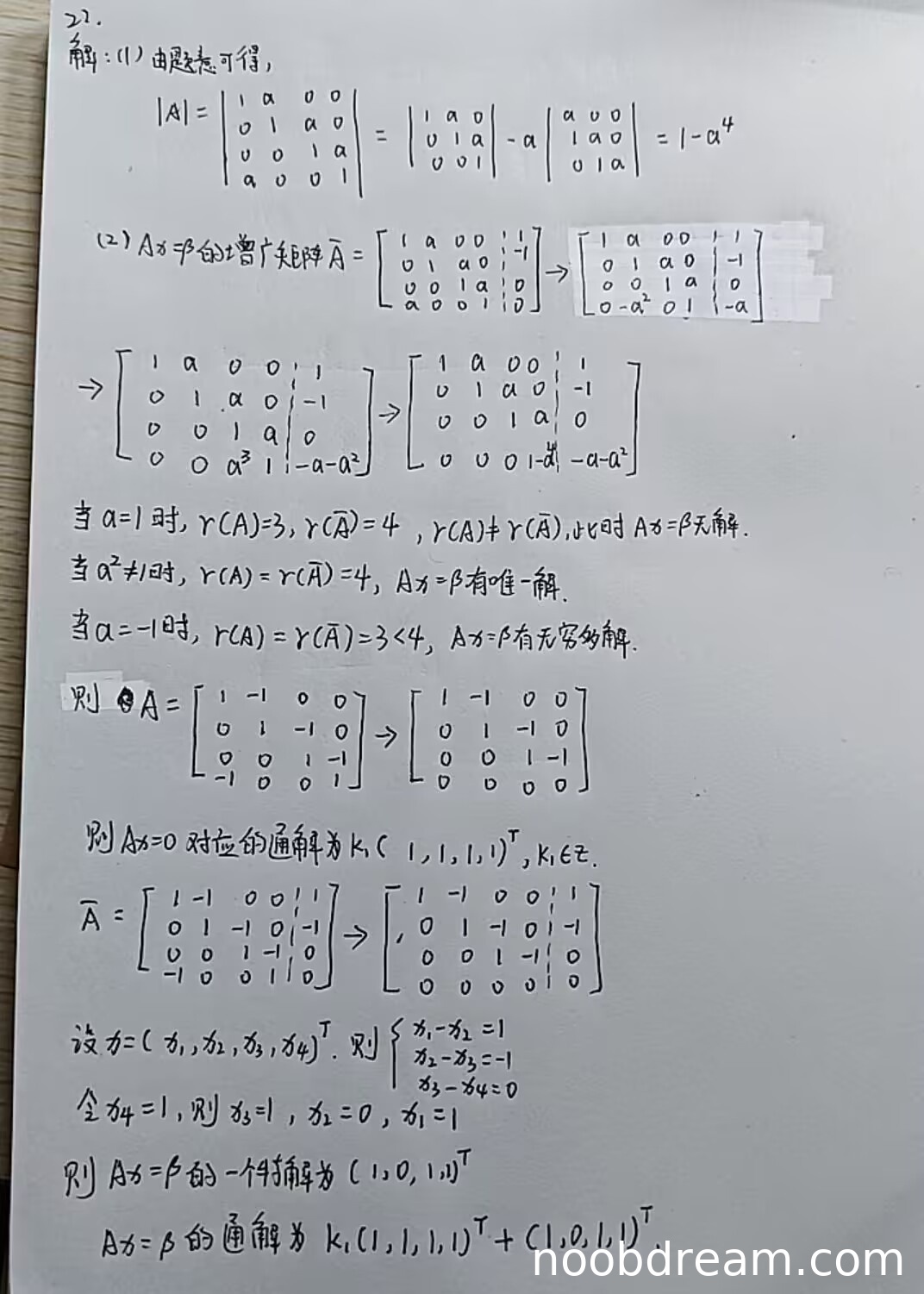 学生计算行列式 |A| 的结果为 1 - a⁴,与标准答案一致。虽然展开过程写得不完整(只写了部分展开步骤),但结果正确。考虑到题目主要考察结果,且计算无误,给予满分。本题(I)部分通常占4分。