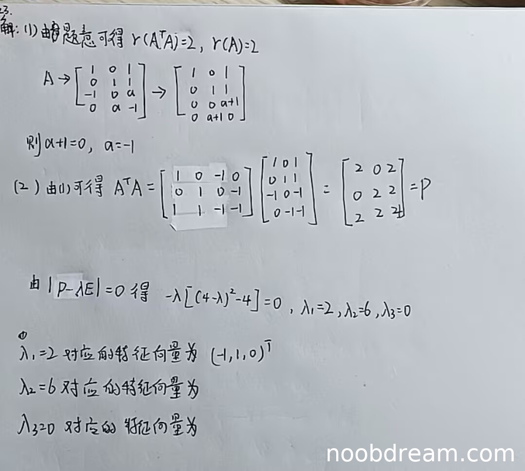 学生正确计算了 AᵀA = [2,0,2; 0,2,2; 2,2,4],特征值计算基本正确(0,2,6)。但特征向量部分不完整,只写出了 λ=2 对应的特征向量,λ=6 和 λ=0 的特征向量都未给出具体结果。正交变换矩阵和标准形也完全缺失。这部分内容缺失较多,扣3分。得分:2.5分