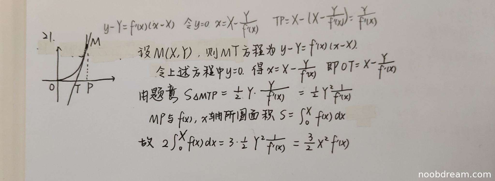 学生正确设出切点 M(X,Y),写出切线方程,并求出 T 点横坐标 X - Y/f'(x),进而得到 TP = Y/f'(x)。正确写出三角形 MTP 的面积为 (1/2)Y²/f'(x)。正确写出由曲线、MP 和 x 轴围成的面积为 ∫₀ˣ f(x) dx。根据题意建立面积比方程 2∫₀ˣ f(x) dx = (3/2)Y²/f'(x),这与标准答案中的方程等价。整个推导过程逻辑清晰,关键步骤正确。