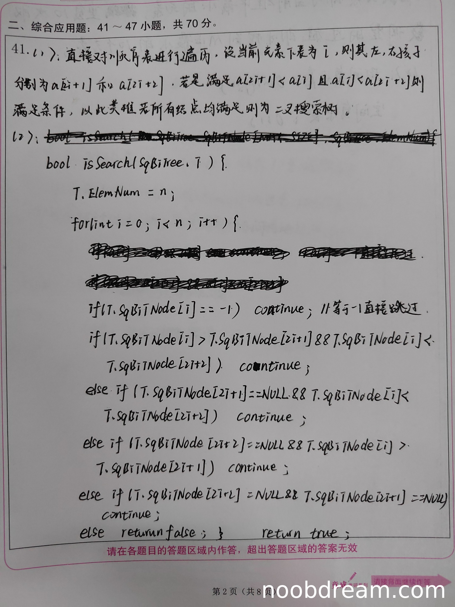 理由:学生的基本设计思想存在严重逻辑错误。二叉搜索树的定义要求左子树所有节点值小于根节点,右子树所有节点值大于根节点,而不仅仅是直接左右孩子节点的比较。学生仅检查当前节点与直接左右孩子的大小关系,无法保证整个子树满足二叉搜索树性质(例如T2中50>40但位于左子树位置,但仅检查直接孩子会漏判这种情况)。不过学生提到了遍历顺序表并检查节点与孩子的关系,体现了部分正确思路,因此给予1分。