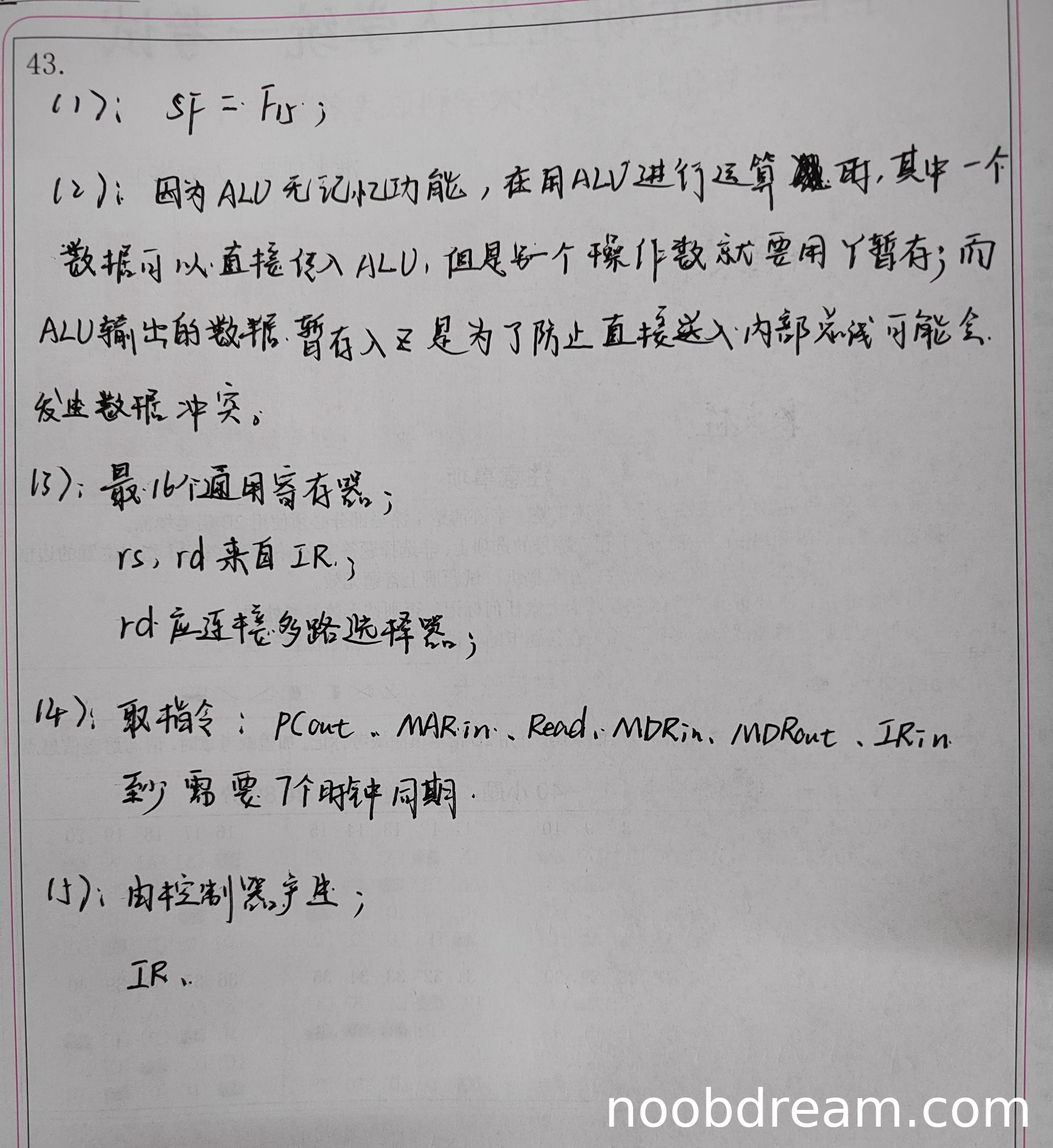 第一问回答正确,GPRs最多有16个通用寄存器;第二问正确指出rs和rd来自IR;第三问回答rd应连接多路选择器错误,根据标准答案应连接地址译码器,扣1分。本小题得2分。