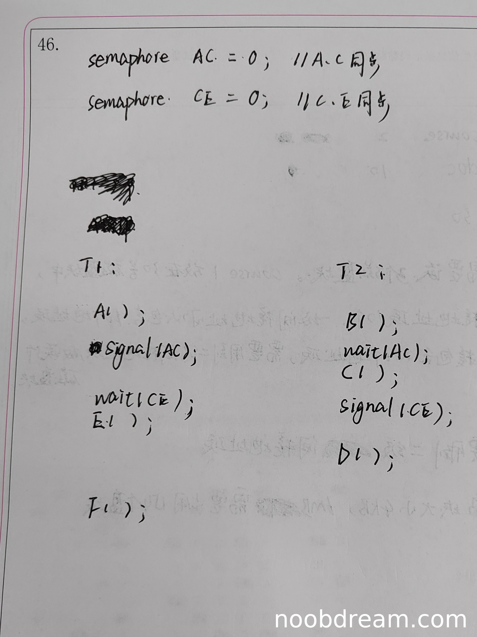 理由:T1中A()后执行Signal(AC),E()前执行wait(CE),F()直接执行,完全符合简化版本的同步要求。操作顺序正确,信号量使用恰当。